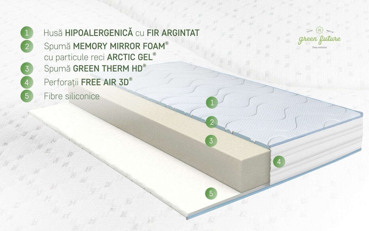 Tesatura moale la atingere, cu ioni de argint, este matlasata pe partea superioara cu 2 cm de spuma Green Therm Memory cu particule Arctic Gel®. Acest strat de confort reactioneaza la caldura corpului si se muleaza pe acesta eliminand punctele de presiune in timpul somnului pentru a relaxa muschii si a asigura o circulatie a sangelui corespunzatoare.