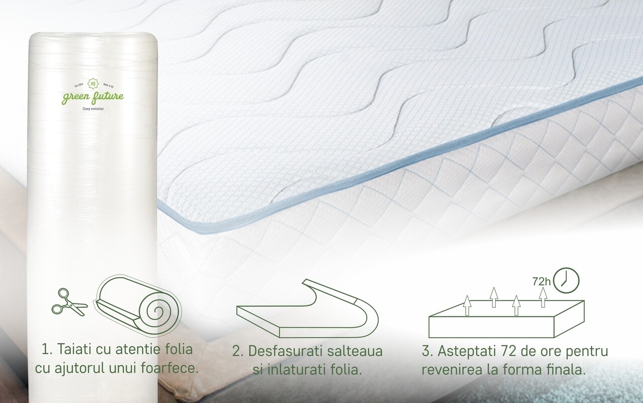 - desfaceti cu grija folia de protectie, fara a folosi cutitul sau alte obiecte taioase care ar putea deterioara tesatura saltelei;