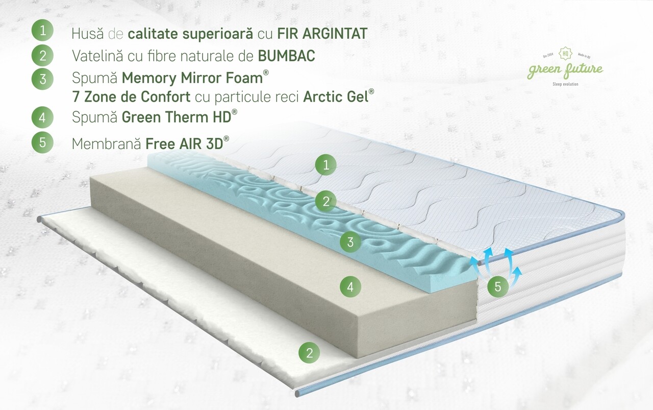 Tesatura moale la atingere, cu ioni de argint, este matlasata cu vatelina cu fibre de bumbac. Stratul generos de confort este format din 6 cm de spuma Green Therm Memory cu particule Arctic Gel® care reactioneaza la caldura corpului si se muleaza pe acesta eliminand punctele de presiune in timpul somnului pentru a relaxa muschii si a asigura o circulatie a sangelui corespunzatoare.