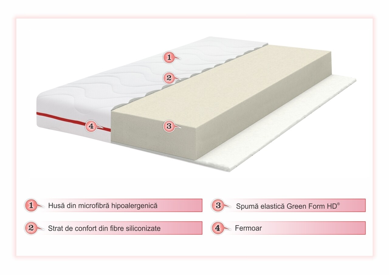 Baza saltelei din spuma elastica Green Form HD in combinatie cu un strat generos de fibre siliconice asigura o sustinere anatomica a corpului si o pozitie corecta a coloanei, fara dureri de spate in timpul somnului.