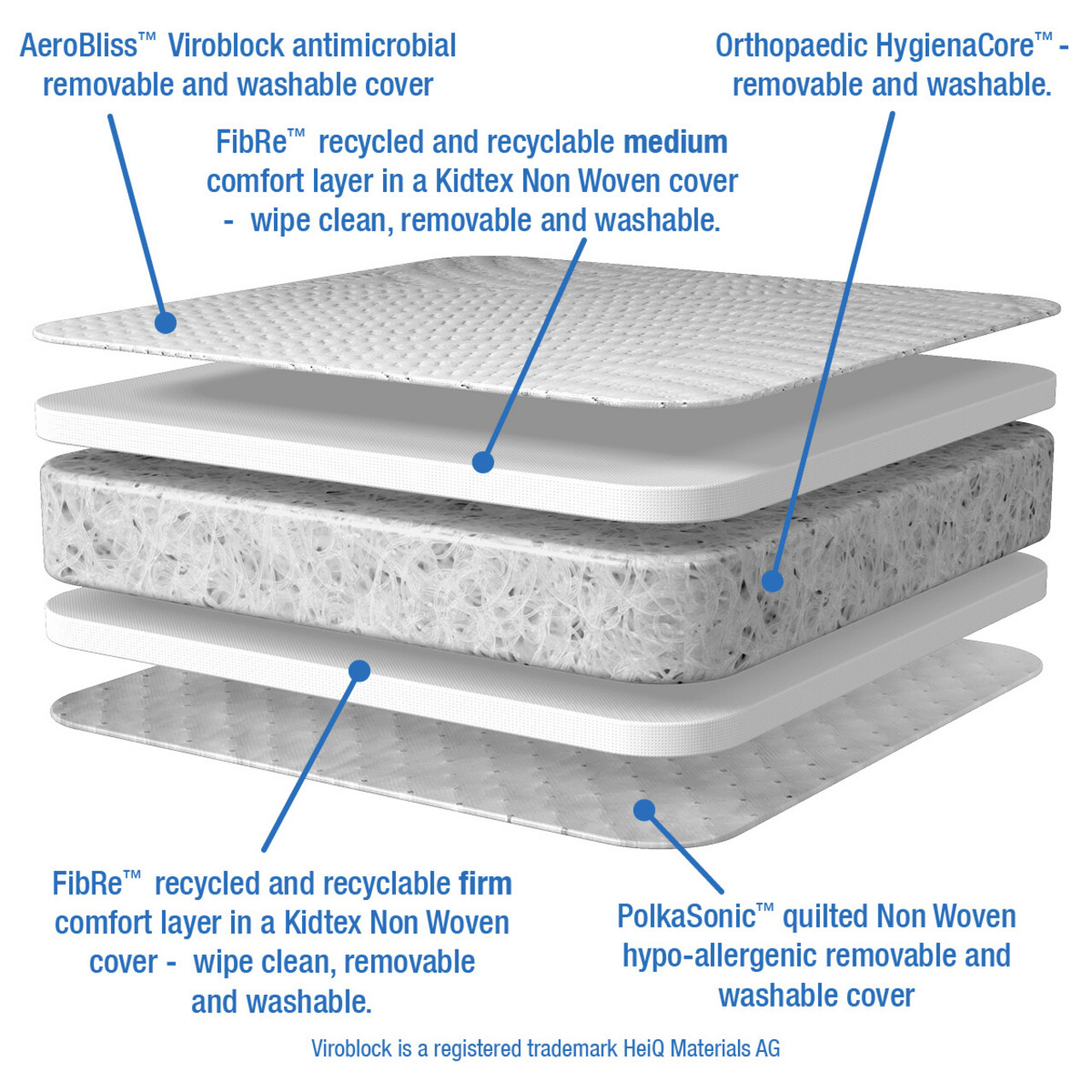 Fabricată din fibre prietenoase cu mediul, unde straturile interioare unice de confort dispun de un sistem muti-modular care poate fi configurate în mod specific în funcție de nevoile și dezvoltarea copilului dumneavoastră și oferă 4 opțiuni pentru diferite suprafețe de dormit ale saltelei, inclusiv mediu, mediu ferm, ferm și extra ferm, oferind un sprijin postural personalizat pentru copilul dumneavoastră pe măsură ce crește.