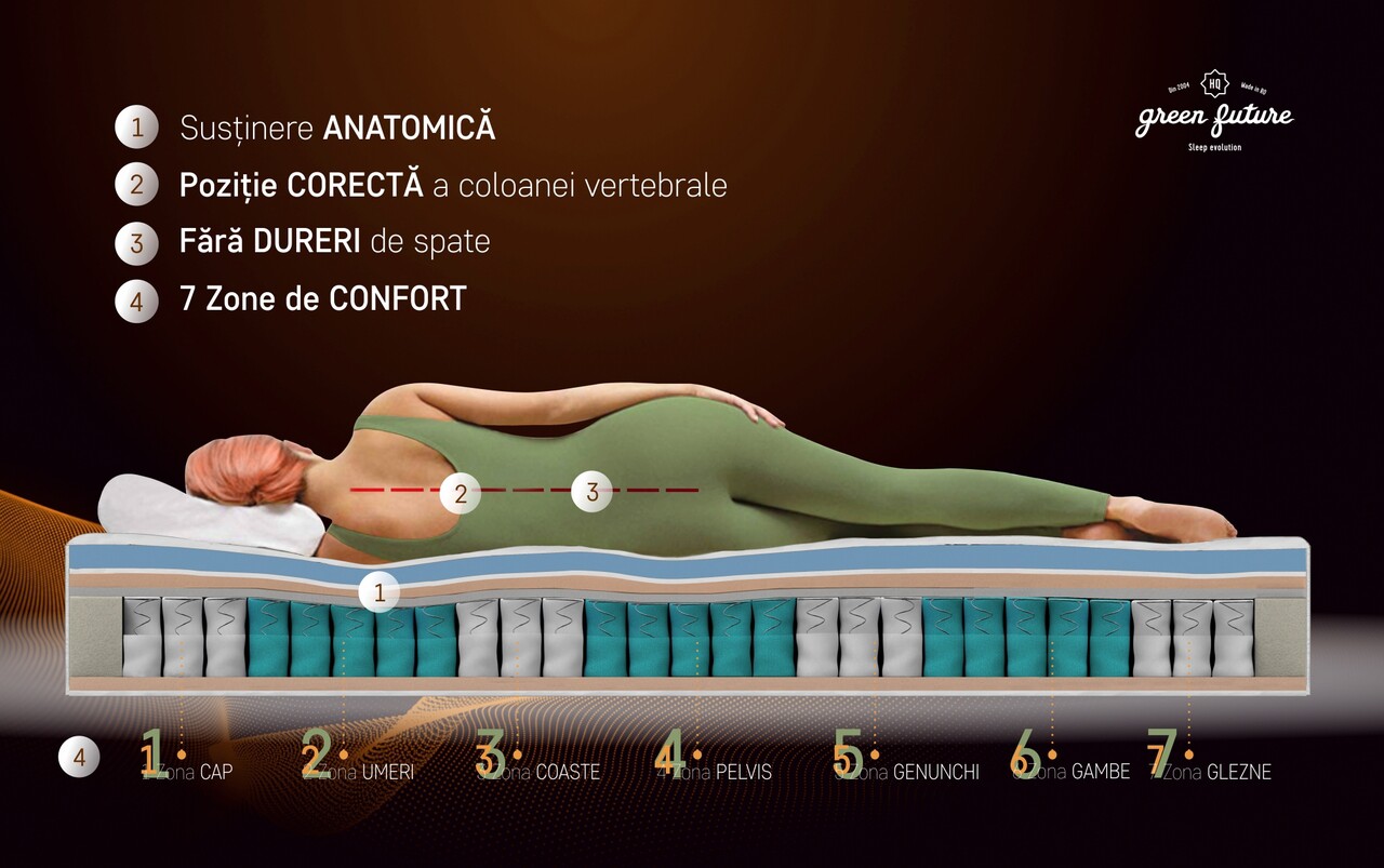 Arcurile sunt grupate în șapte zone de confort pentru o susținere corectă a corpului și coloanei în timpul odihnei.