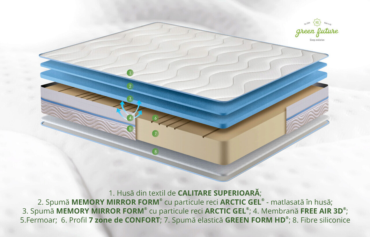 Dezvoltata in facilitatile de productie Green Future din Romania impreuna cu specialisti in ortopedie, salteaua Arctic Gel Memory 7 zone de Confort imbina calitatile spumei elastice Green Form HD cu cele ale spumei Memory cu particule reci Arctic Gel pentru un confort ortopedic si termic excelent.