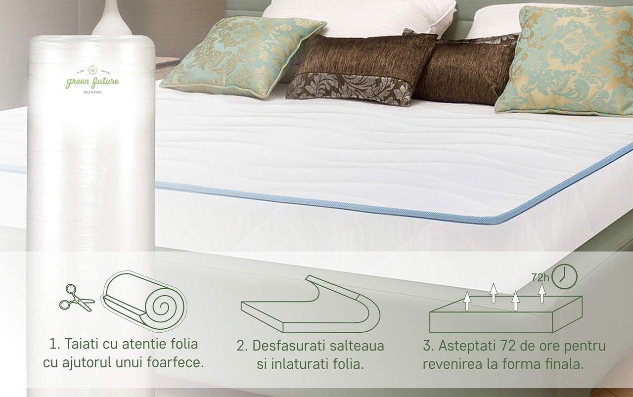 - desfaceti cu grija folia de protectie, fara a folosi cutitul sau alte obiecte taioase care ar putea deterioara tesatura saltelei.