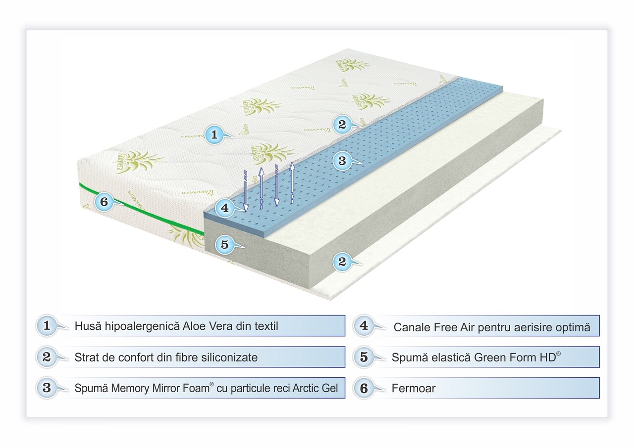 Salteaua este conceputa cu materiale de cea mai buna calitate. Baza saltelei din spuma elastica Green Form HD® cu celulatie deschisa asigura o sustinere anatomica a corpului si o pozitie corecta a coloanei, fara dureri de spate in timpul somnului si un strat generos de 3 cm Spuma Memory Mirror Foam cu particule reci Arctic Gel® cu rol de a ameliora punctele de presiune (umeri, solduri si picioare) pentru a oferi o relaxare total a muschilor in timpul somnului.