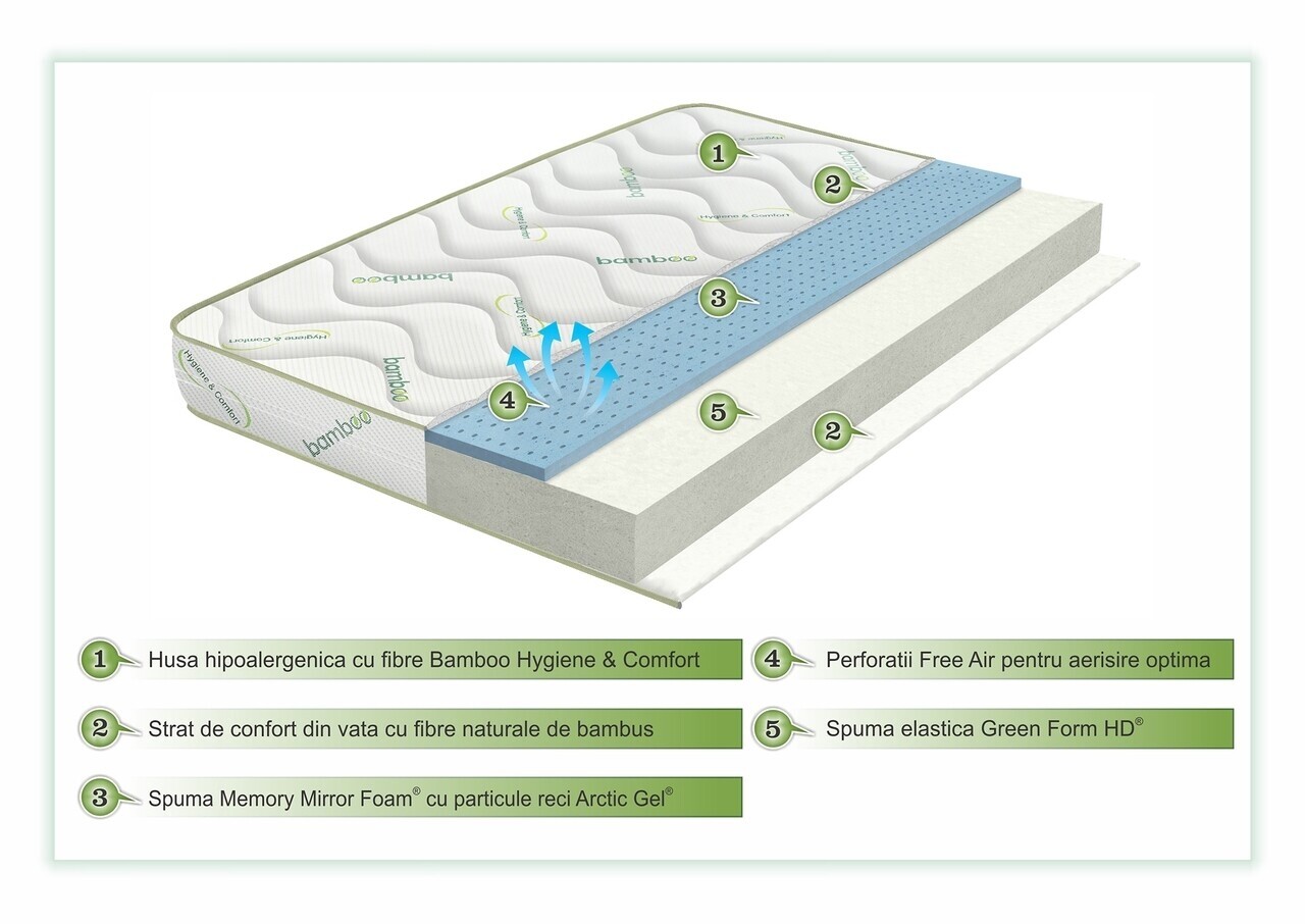 Dezvoltata de Green Future impreuna cu specialisti alergologi si ortopezi, salteaua Cool Bamboo Memory combina calitatile ortopedice ale spumei elastice Green Form HD® cu cele termice ale spumei Mirror Foam® Memory cu particule reci Arctic Gel® si proprietatilee naturale a fibrelor de bambus.
