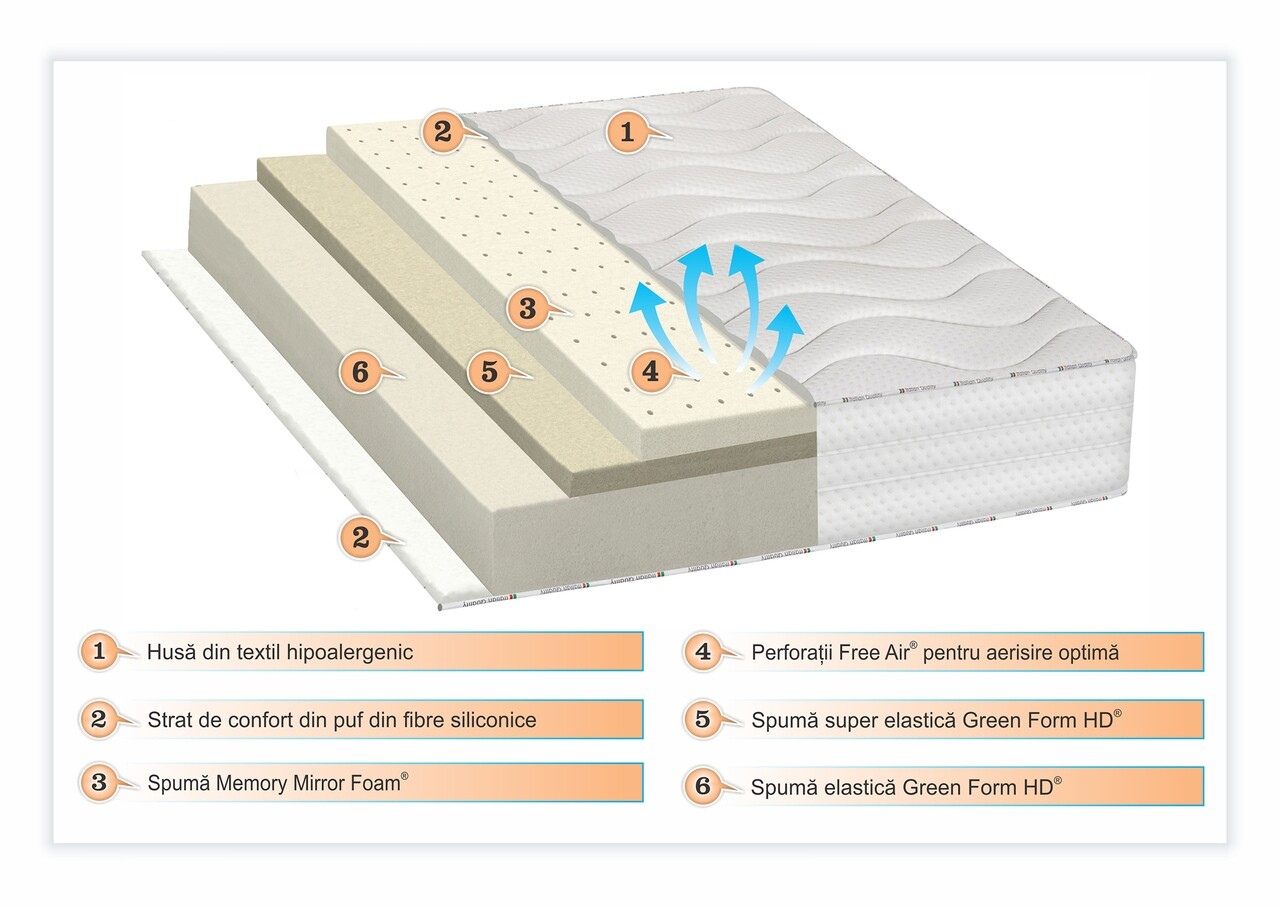 Salteaua este conceputa cu materiale de calitate superioara cu certificare internationala OEKO-TEX. Husa moale la atingere din fibre Hipoalergenice este matlasata cu vatelina confortabila cu fibre de bumbac. Salteaua imbina tehnologia spumei elastice Green Form HD® cu cea a spumei Memory Mirror Foam® pentru un confort ortopedic si anatomic excelent.