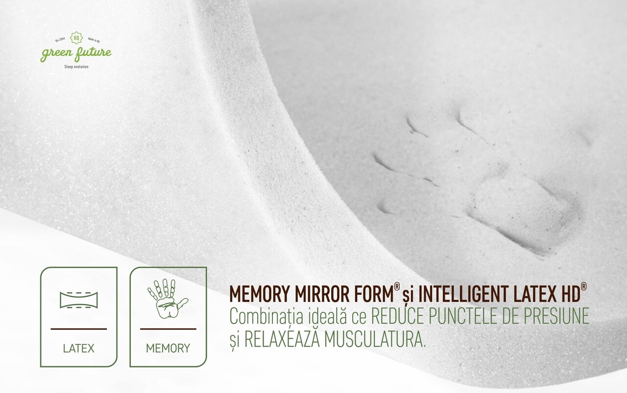 Stratul de 3 cm spumă Memory Mirror Form® se adaptează perfect conturului corpului, asigurând o distribuție uniformă a greutății și o susținere personalizată. În plus, datorită structurii sale inovative, Intelligent Latex HD® asigură o aerisire superioară și o stabilitate termică îmbunătățită, menținând o temperatură confortabilă pe parcursul întregului an. Elasticitatea latexului îl face un material nedeformabil, extrem de durabil pe termen lung.