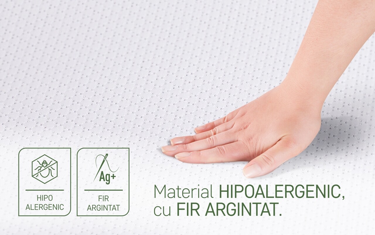 Husa hipoalergenica, realizata din tesatura cu ioni de argint, imbunatateste confortul si permite o ventilatie optima, asigurand in acelasi timp un mediu igienic pentru un somn sanatos si calitativ.