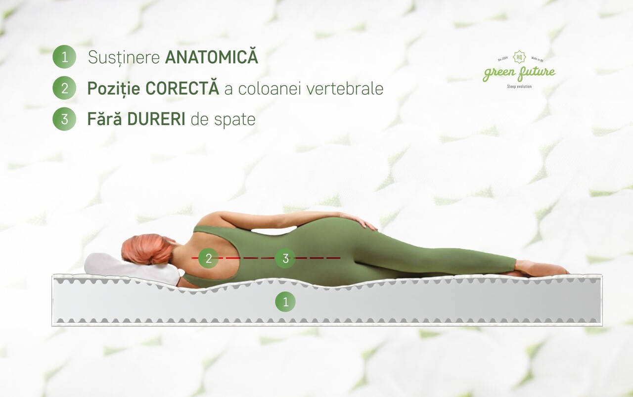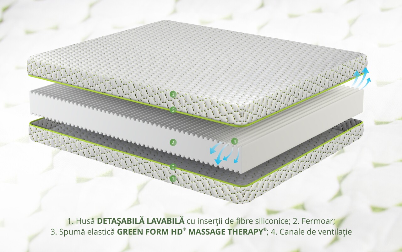 Micromasaj: Structura din spuma elastica Green Form HD® Massage Therapy® asigura o pozitie naturala a coloanei vertebrale in timpul somnului oferind astfel, relaxarea muschilor si o buna circulatie sanguina.