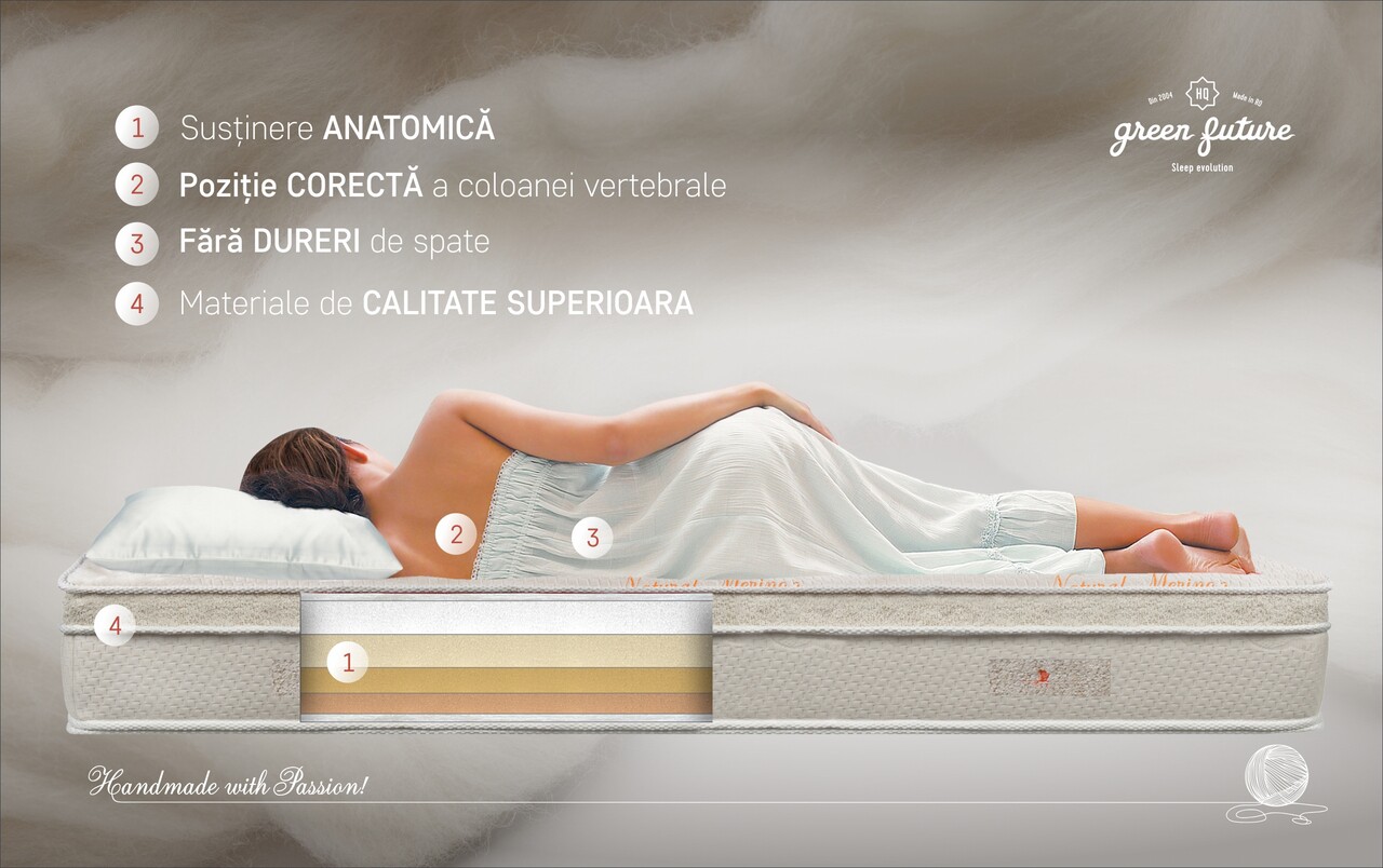 Salteaua Green Future Wool îndeplinește trei funcții fundamentale, esențiale pentru orice saltea de calitate superioară. În primul rând, aceasta beneficiază de un rol ortopedic important, care susține corect coloana vertebrală, asigurându-i o poziție naturală și corectă, necesară pentru o relaxare optimă a încheieturilor. Al doilea rol al saltelei este unul anatomic, care contribuie la relaxarea completă a mușchilor, favorizând astfel o circulație sanguină sănătoasă și eficientă. În cele din urmă, salteaua Green Future Wool îndeplinește și un rol ergonomic, fiind concepută pentru a oferi un confort superior pe parcursul întregului somn, astfel încât să vă treziți revigorat și odihnit.