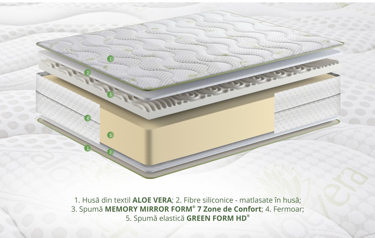 Salteaua Aloe Vera PLUS Dual Confort, creata de Green Future in colaborare cu experti in ortopedie, imbina performanta spumei elastice Green Form HD® si adaptabilitatea spumei Memory Mirror Form® cu beneficiile naturale ale extractului de Aloe Vera, recunoscut pentru efectele sale calmante si antiinflamatoare.