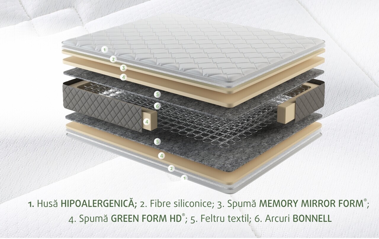 Stratul de arcuri este completat de spuma elastica Green Form HD® cu celulatie deschisa care are proprietati ortopedice, asigura o pozitie naturala si corecta in timpul somnului, prevenind si diminuand astfel durerile de spate sau cervicale.