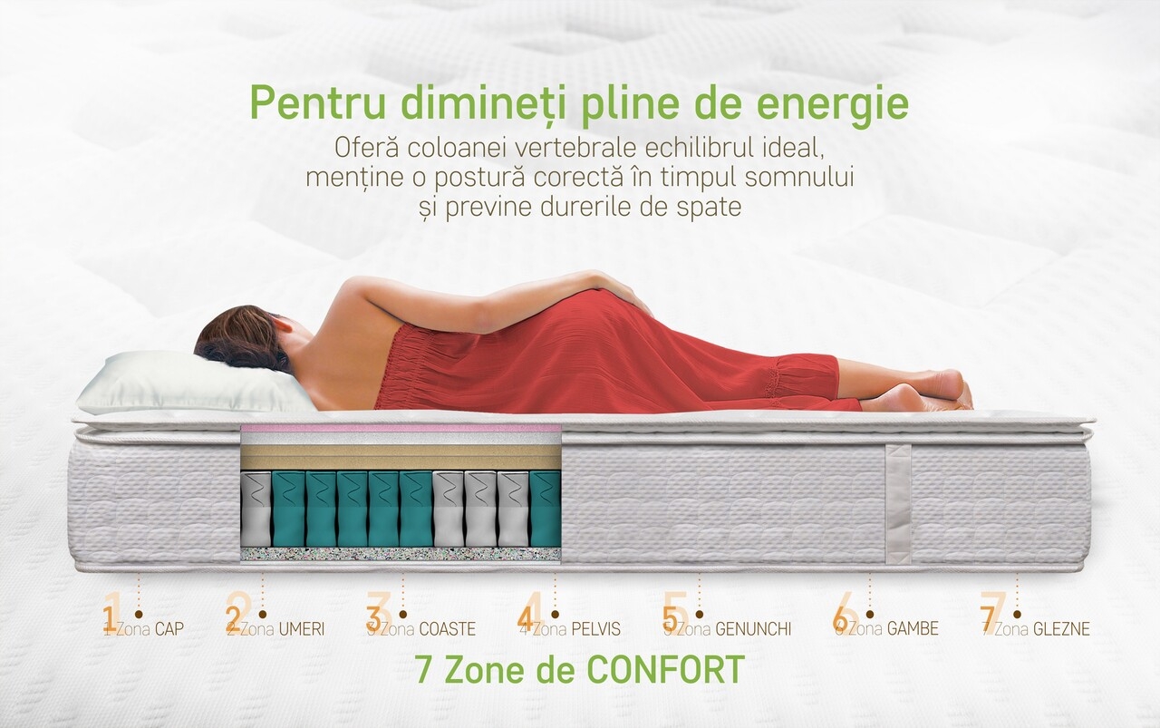 Structura sa inteligenta, bazata pe tehnologia arcurilor individuale 7Z Green Pocket®, urmareste cu precizie liniile corpului, reducand punctele de presiune. In completare, stratul Green Cyrcle Foam® ofera stabilitate, rezistenta si o senzatie naturala de echilibru, exact acolo unde ai nevoie.