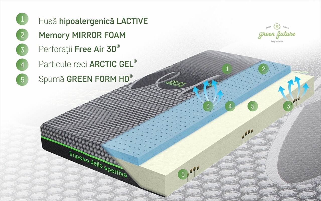Conceputa cu materiale de calitate superioara certificate Oeko-Tex, salteaua imbina tehnologia spumei super elastice Green Form HD® si a spumei Memory Mirror Form® cu particule reci Arctic Gel pentru un confort ortopedic si anatomic excelent.