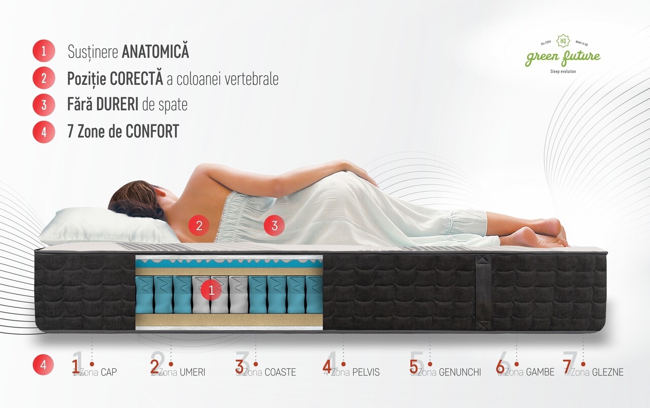 - Pentru a prelungi durata de viața a saltelei, vă recomandăm achiziționarea protecției speciale GREEN-FUTURE. Protecția specială poate fi ușor întreținută, permițând spălarea în mașina de spălat sau manual cu apă rece.