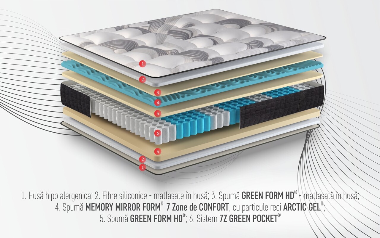 Stratul principal de confort al saltelei este alcătuit din spumă elastica Green Form HD®, cu celulație deschisă, și 3 cm spuma Memory Mirror Form®, îmbogățită cu particule reci Arctic Gel. Aceste materiale inovative se adaptează perfect formei corpului, eliminând punctele de presiune și contribuind la relaxarea mușchilor, asigurând totodată o circulație sanguină sănătoasă pe parcursul somnului. În plus, particulele de gel rece din stratul cu memorie reglează temperatura, oferind un confort termic optim pentru un somn odihnitor.