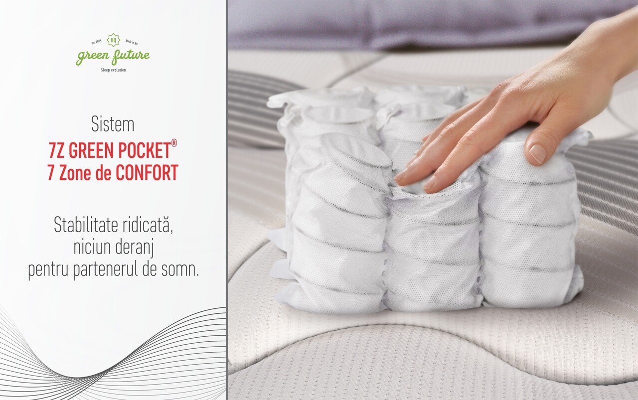 Baza saltelei este dotata cu arcuri tip Pocket, ambalate individual, care garanteaza o pozitie ortopedica corecta pe parcursul somnului. Acest sistem, preferat de specialistii din industria hoteliera, reprezinta tehnologia de varf pentru confortul optim al somnului, prevenind durerile de spate. Fiecare arc este invelit intr-o casetă textilă și acționează independent, adaptându-se perfect la conturul corpului, fără a influența mișcările celorlalte arcuri. Astfel, se asigură stabilitate crescută și nu se produce deranj pentru partenerul de somn. În plus, tehnologia 7Z Green Pocket® oferă un suport diferențiat pentru diferite zone ale corpului, în funcție de presiunea exercitată, contribuind la alinierea corectă și sănătoasă a coloanei vertebrale.