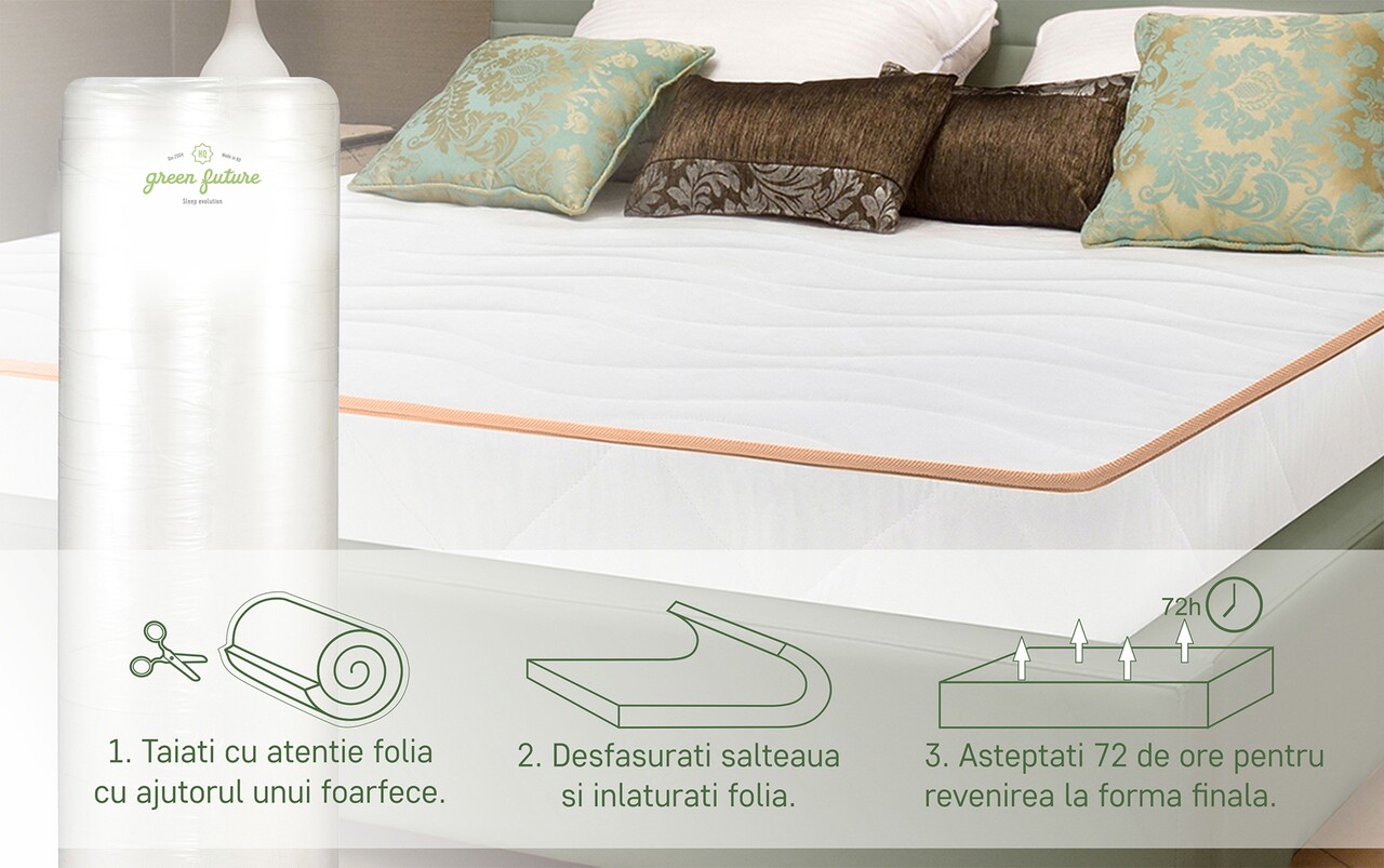 - desfaceti cu grija folia de protectie, fara a folosi foarfece sau alte obiecte taioase care ar putea deterioara tesatura saltelei.