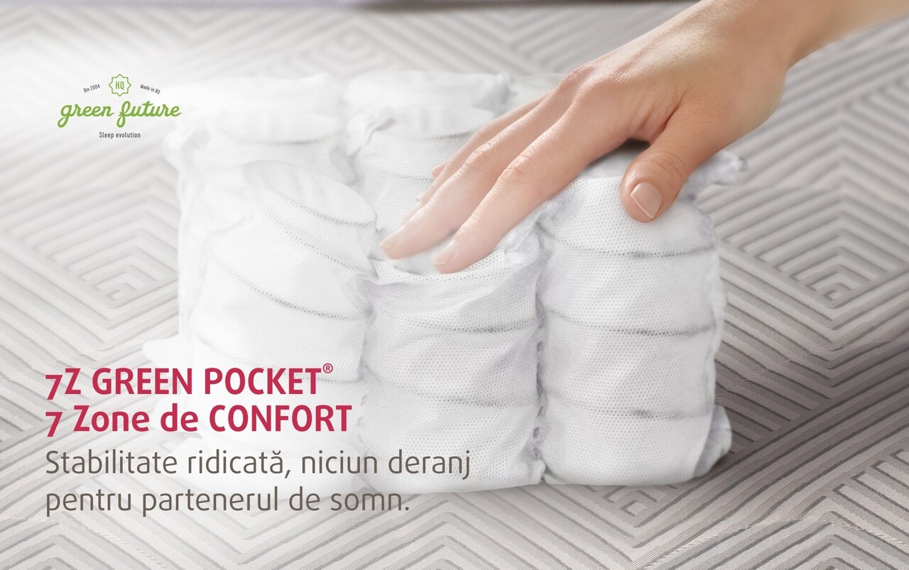 Baza saltelei este alcătuită din arcuri Pocket, fiecare fiind ambalat individual, o tehnologie inovatoare ce asigură un confort deosebit în timpul somnului. Aceste arcuri acționează independent în funcție de presiunea aplicată, adaptându-se perfect la contururile corpului. Fără legături între ele, fiecare arc își menține mișcarea autonomă, sporind astfel stabilitatea saltelei. Mai mult, sistemul 7Z Green Pocket® oferă un suport diferentiat pentru diversele zone ale corpului, în funcție de presiunea exercitată, asigurând o aliniere corectă și sănătoasă a coloanei vertebrale pe întreaga durată a somnului.