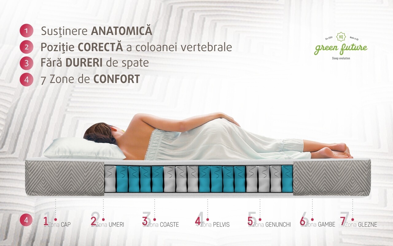 Baza saltelei este alcătuită din arcuri Pocket, fiecare fiind ambalat individual, o tehnologie inovatoare ce asigură un confort deosebit în timpul somnului. Aceste arcuri acționează independent în funcție de presiunea aplicată, adaptându-se perfect la contururile corpului. Fără legături între ele, fiecare arc își menține mișcarea autonomă, sporind astfel stabilitatea saltelei. Mai mult, sistemul 7Z Green Pocket® oferă un suport diferentiat pentru diversele zone ale corpului, în funcție de presiunea exercitată, asigurând o aliniere corectă și sănătoasă a coloanei vertebrale pe întreaga durată a somnului.