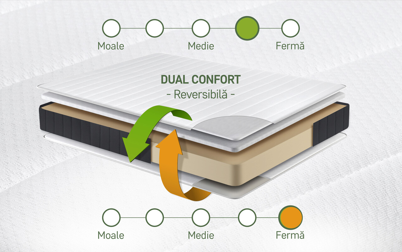 SERENA DUAL CONFORT este o saltea super-ortopedica cu ce poate fi folosita pe ambele parti: partea cu stratul Green Form HD® pentru o fermitate ridicata sau cea cu stratul FIBER COMFORT® pentru o fermitate usor redusa.