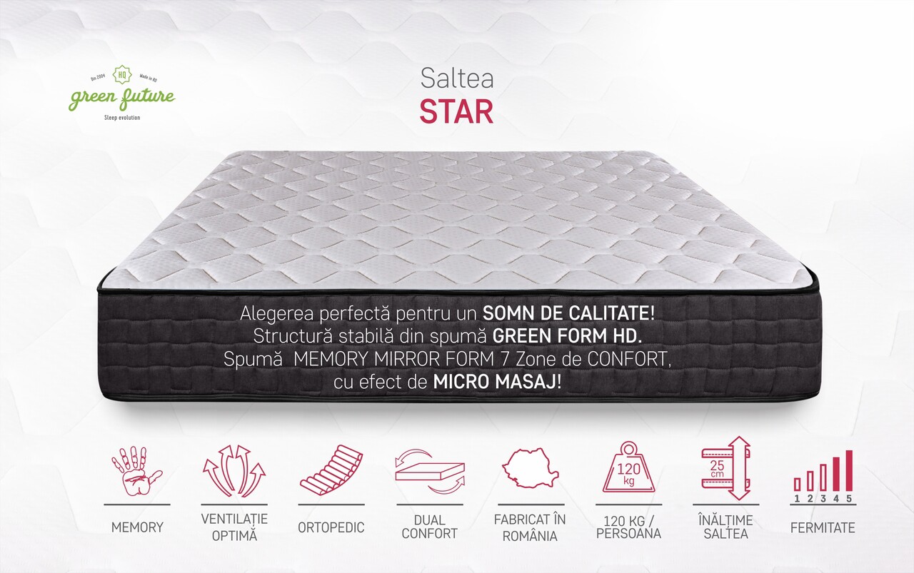 Salteaua Green Future STAR Memory este un concept ce imbina perfect caracteristicile ortopedice ale spumei elastice Green Form HD® cu confortul excepțional oferit de spuma Mirror Foam® Memory, pentru o experiență de somn remarcabilă.