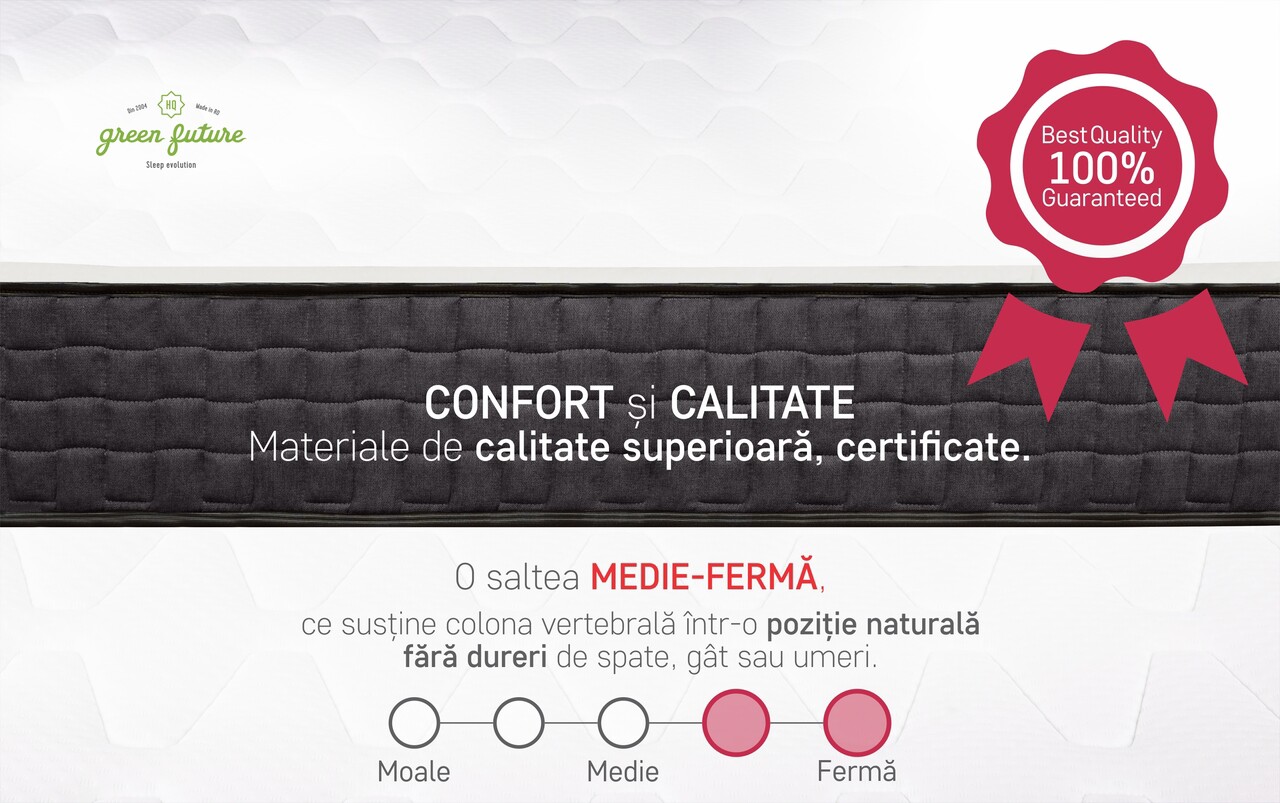 Dezvoltată în colaborare cu specialiști ortopezi, salteaua Green Future STAR Memory se remarcă prin utilizarea unor materiale de înaltă calitate, oferind suportul ideal pentru menținerea unei posturi ortopedice corecte pe durata nopții. Acest design avansat contribuie la ameliorarea presiunii și la alinierea optimă a coloanei vertebrale, asigurând un somn odihnitor și reconfortant.