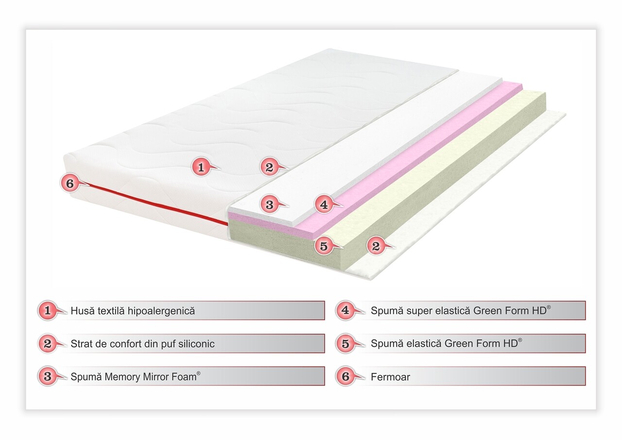 Tehnologia avansata a spumei suport Green Form HD® impreuna cu cea a stratului de Green Therm Memory® asigura un somn fara propagarea miscarilor partenerului.