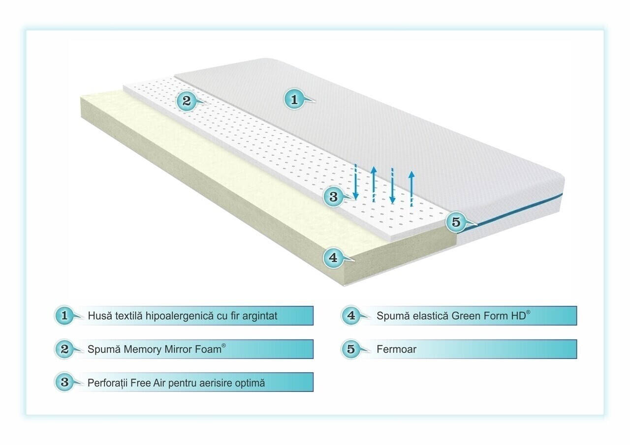 Stratul de confort din spuma Memory Mirror Form® este prevazut cu gauri de vantilatie pe toata suprafata pentru aerisire corespunzatoare si mentinerea unui mediu uscat si fara acarieni in timpul somnului.