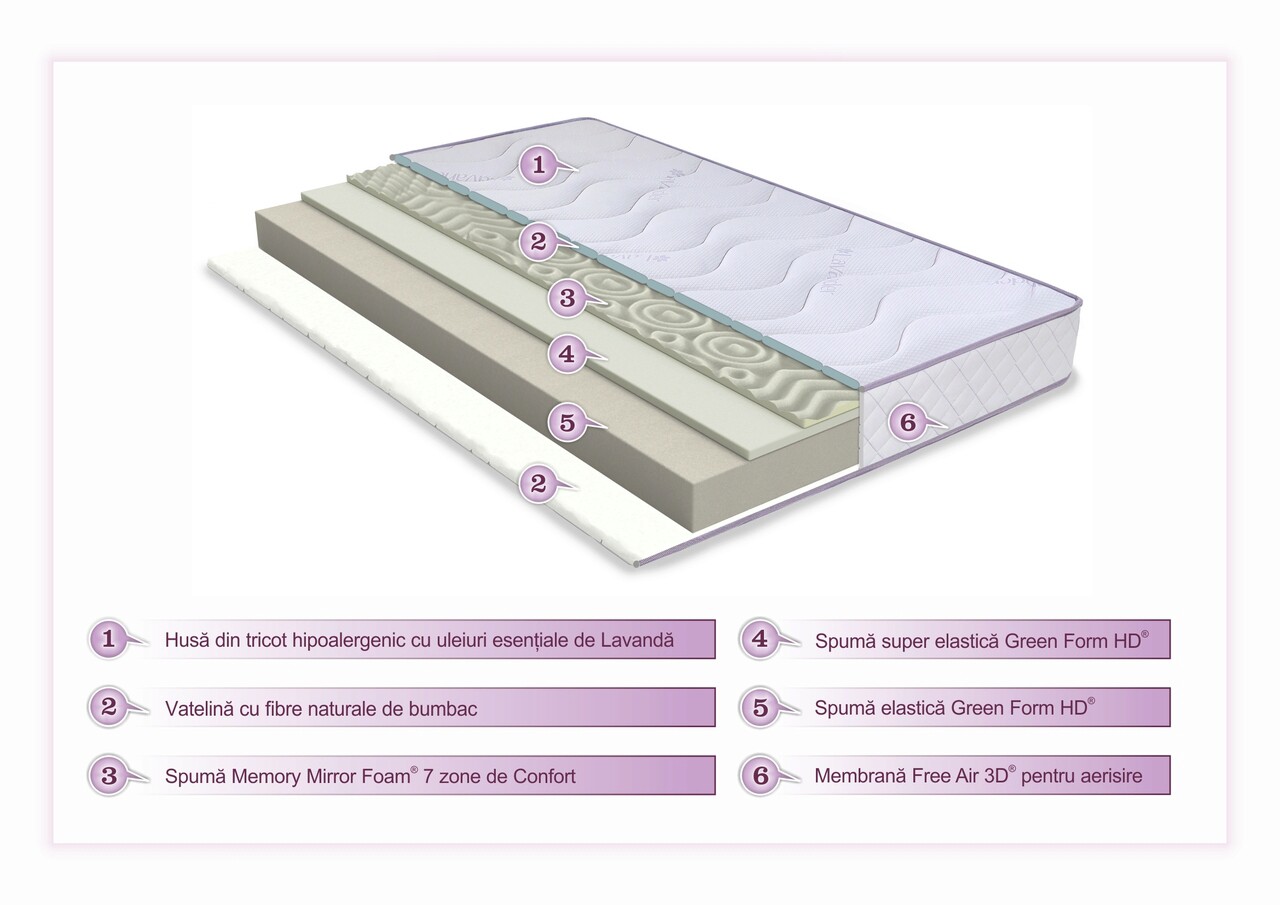 Salteaua Super Ortopedica Tri Flexa Lavanda Therapy, 12+3+3 Memory combina calitatile ortopedice ale spumei elastice Green Form HD® cu confortul spumei Green Therm Memory® si proprietatile anti-stress ale uleiurilor esentiale de Lavanda.
