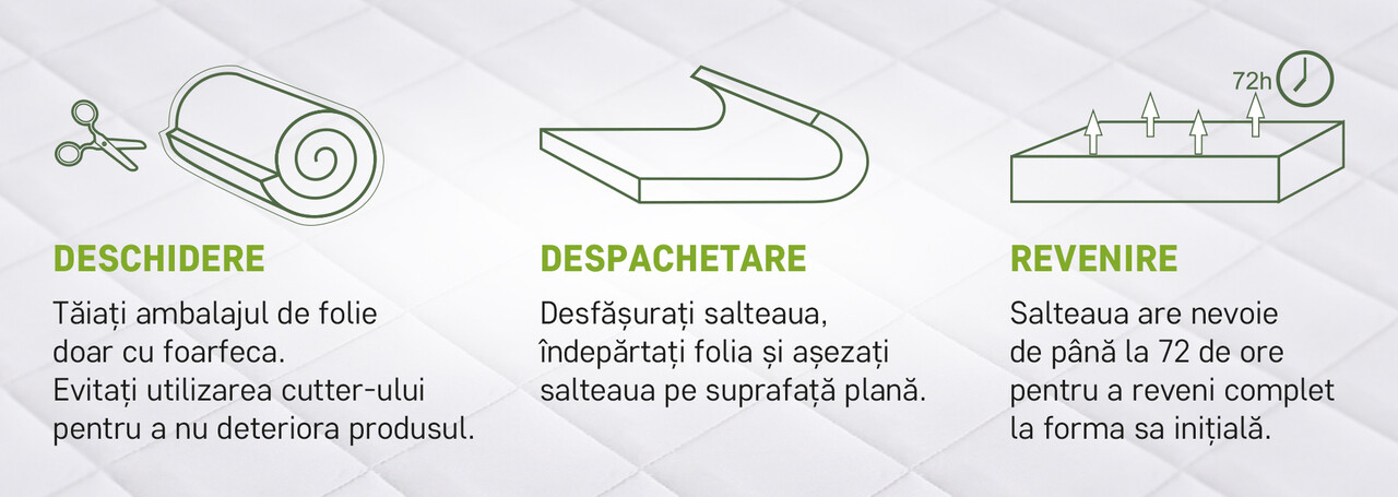 - desfaceti cu grija folia de protectie, fara a folosi cutitul sau alte obiecte taioase care ar putea deterioara tesatura saltelei.