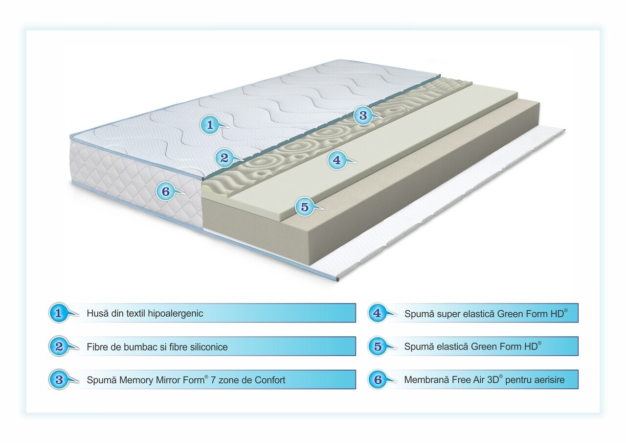 - 3 cm de spuma super elastica Green Form HD® care actioneaza ca un strat intermediar de mini arcuri intre baza de suport al corpului si cel de memory. Are rolul de a imbunatati sustinerea corpului in zonele lombara, cervicala si a genunchilor.