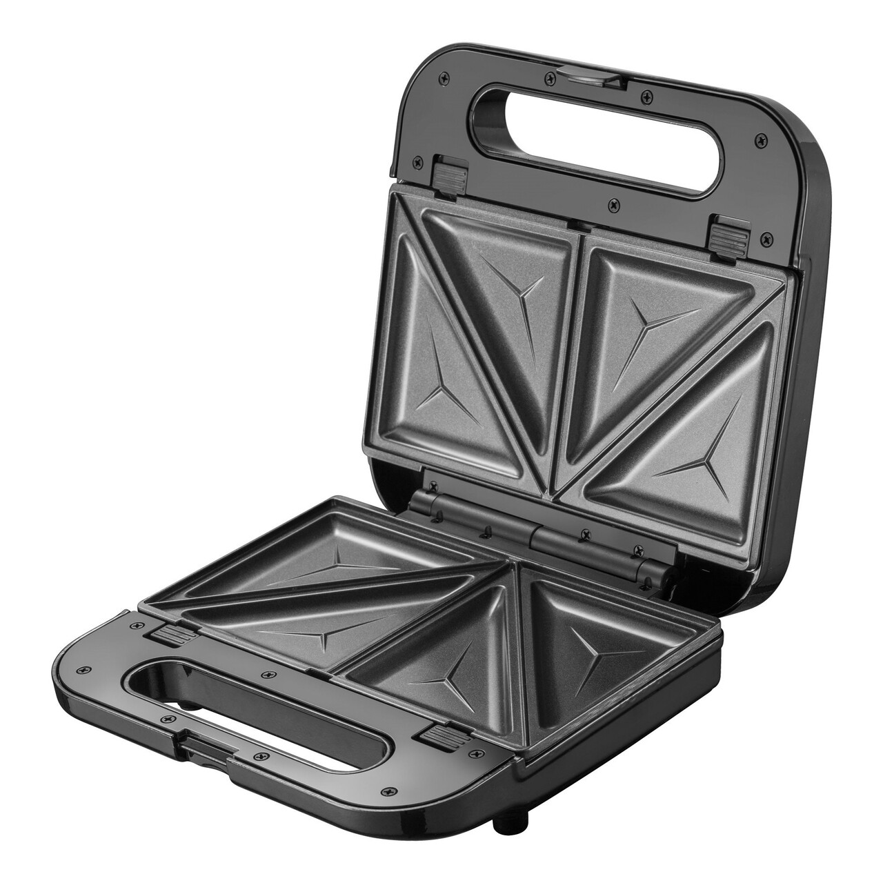 Aparatul poate prepara pana la 2 sandvisuri in forma de triunghi in acelasi timp, 2 vafe sau un sandvis panini. Asezati sandvisurile pregatite sau aluatul de vafe pe placile antiaderente, inchideti capacul cu clema de blocare si in cel mai scurt timp obtineti un mic-dejun delicios sau desertul preferat!