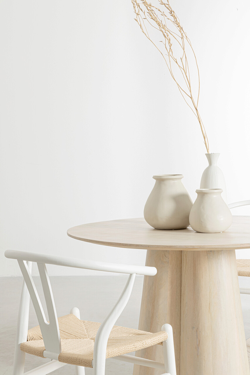 Cadru din lemn de ulm. Sezut din sfoara de hartie, finisaj din poliuretan. Inaltime sezut: 46 cm.