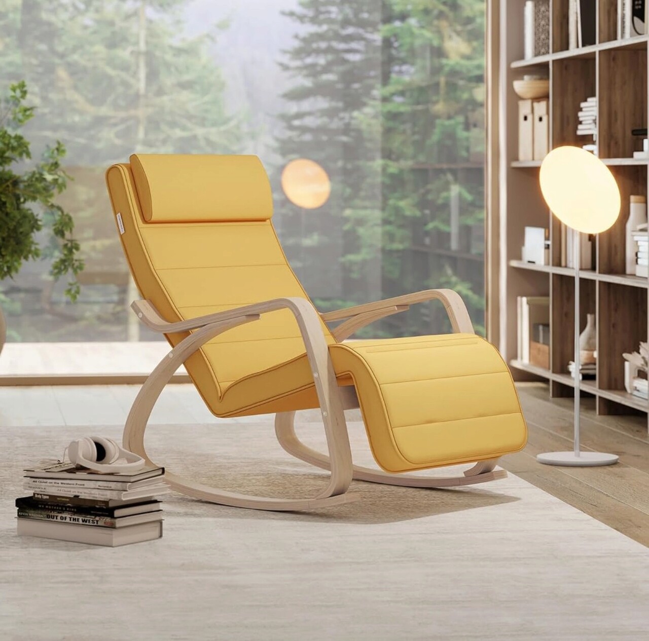 Scaun balansoar reglabil in 5 pozitii, Songmics, 67x121.5x84 cm, max 150 kg, lemn de mesteacan/policoton, galben pastel/natural