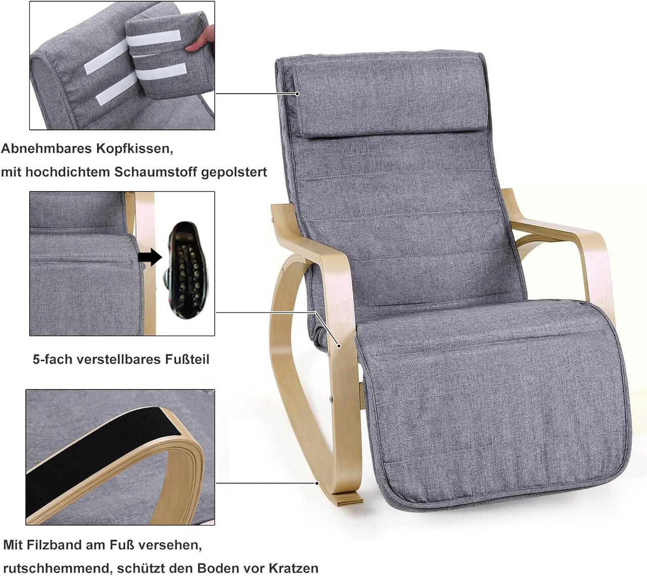 Scaun balansoar reglabil in 5 pozitii, Songmics, 67x121.5x84 cm, max 150 kg, lemn de mesteacan/textil cu aspect de in, gri/natural