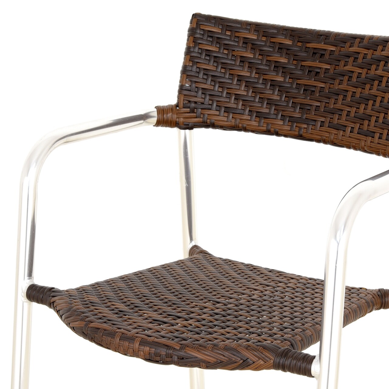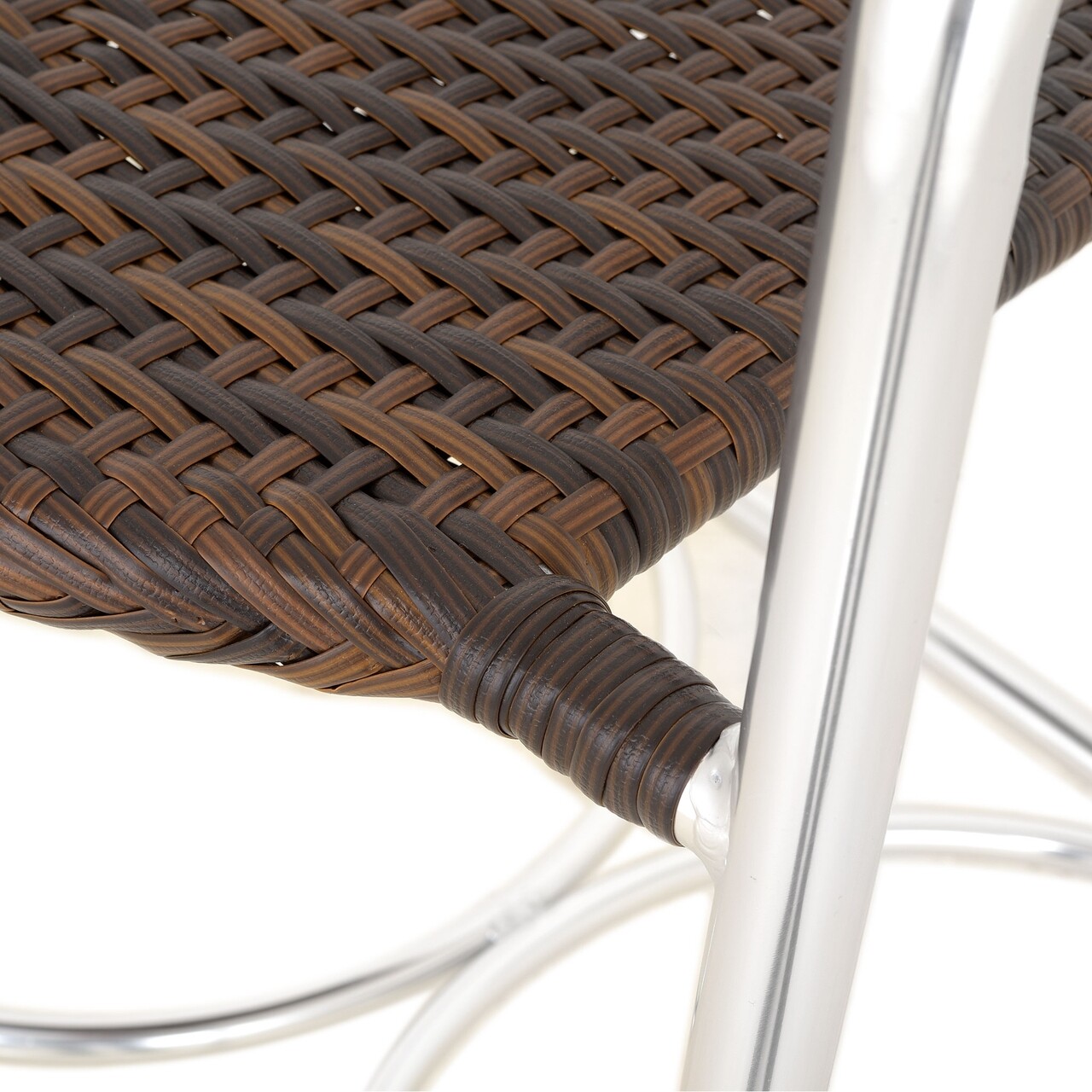 Scaunul este realizat din structura de aluminiu impletita cu fibre sintetice tratate UV, ce imita ratanul si este suprapozabil.
