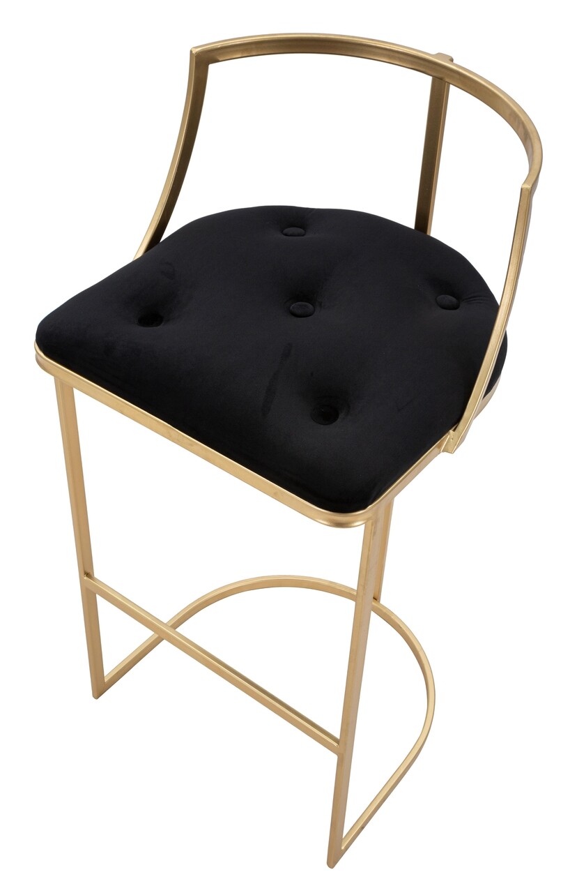 Scaun de bar din metal auriu cu spatar. Scaunul este realizat din catifea sintetica captusita. Liniile simple si geometrice il fac perfect pentru orice tip de mobilier.