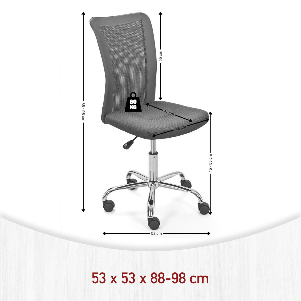 Baza metalica cromata de inalta calitate, cu 5 roti de siguranta cu frana in functie de sarcina, reglabila continuu pe inaltime, scaun rotativ si o capacitate maxima de incarcare de pana la 80 kg.