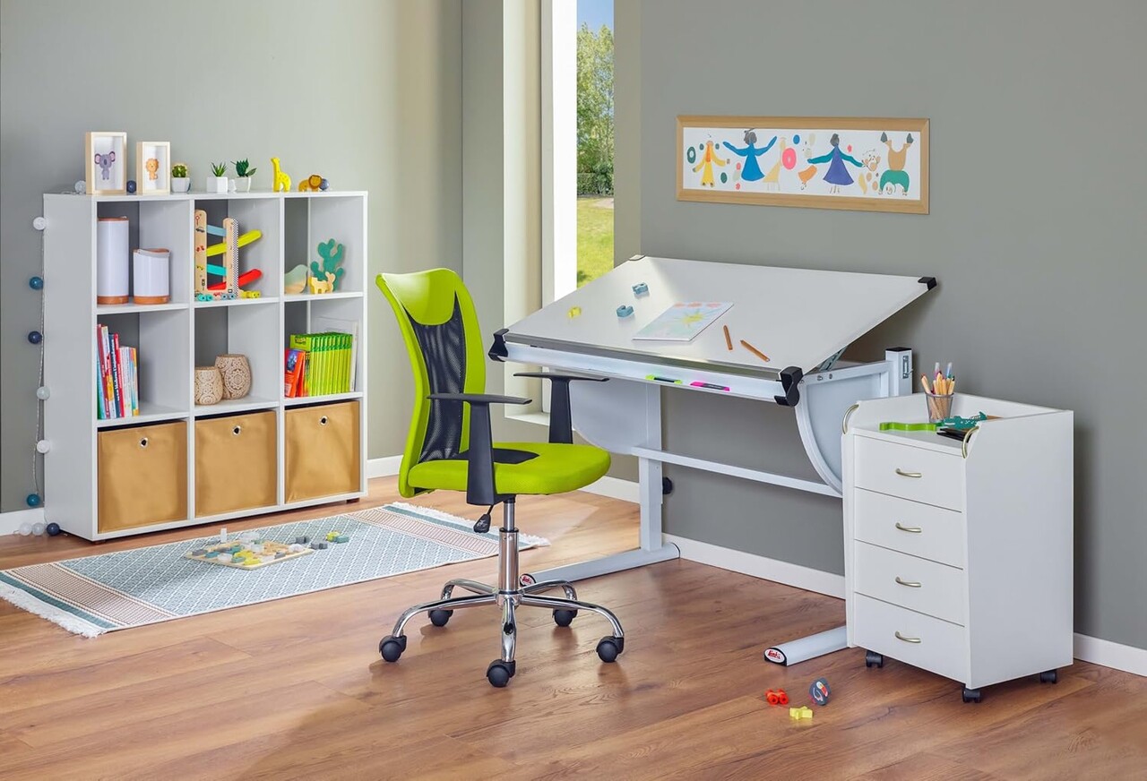 Acest scaun rotativ pentru copii ofera suport pentru temele zilnice si sesiunile de studiu. Designul modern este disponibil in mai multe culori la moda. Husa din plasa respirabila reduce transpiratia in timpul perioadelor lungi de sedere. Spatarul se ajusteaza la postura utilizatorului. Relaxat si sanatos: Spatarul cu forma ergonomica sustine partea inferioara a spatelui si promoveaza o postura corecta, ajutand la prevenirea durerilor de spate. Scaunul dispune, de asemenea, de cotiere pentru a ameliora tensiunea din jurul umerilor. Este echipat cu o baza metalica cromata de inalta calitate, cu cinci roti de siguranta cu frana, dependente de sarcina, si un arc pe gaz de siguranta certificat, care sustine o greutate maxima de 100 kg. Arcul pe gaz permite reglarea continua a inaltimii, asigurand un confort optim pentru perioade lungi de sedere.