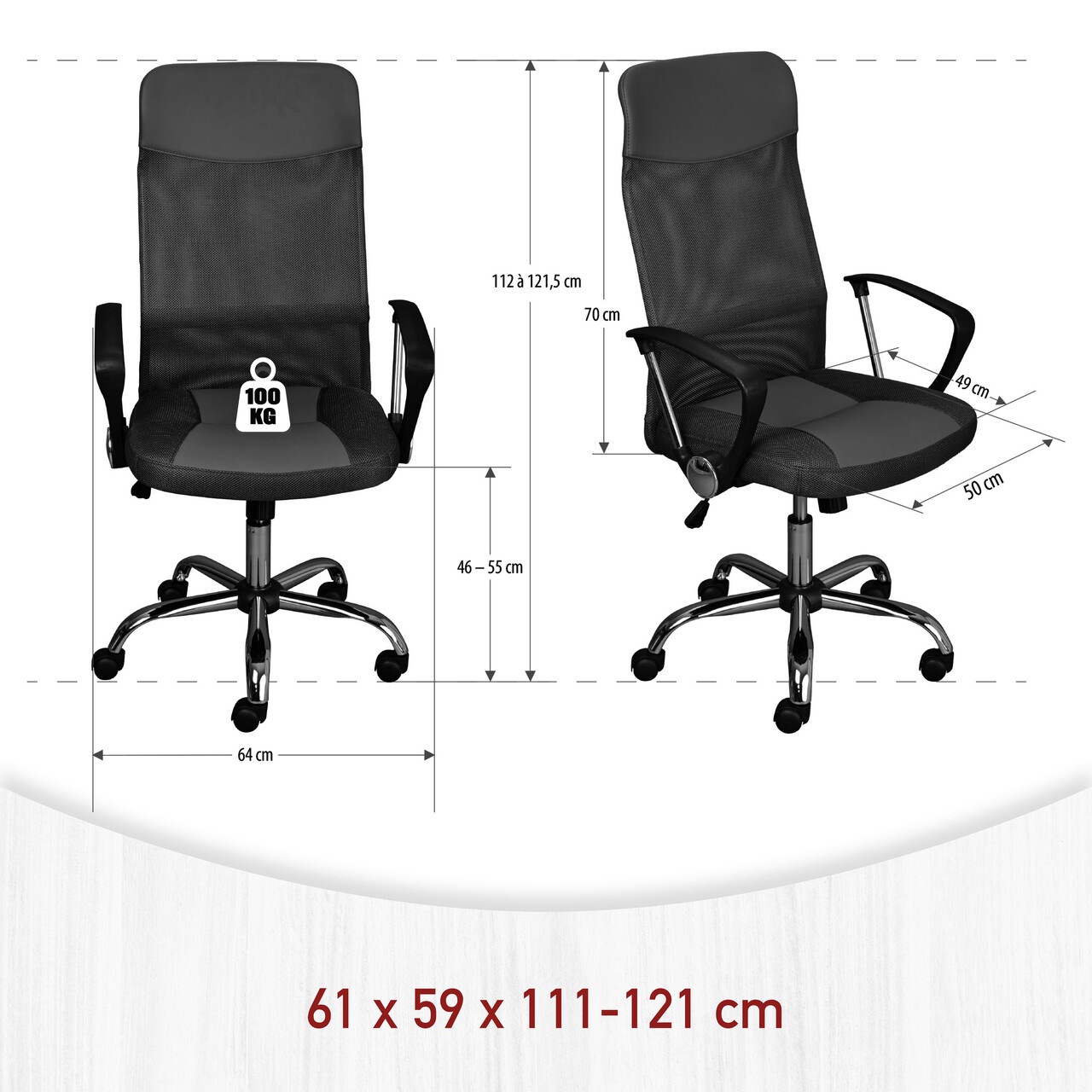 Baza metalica cromata de inalta calitate, cu 5 roti de siguranta cu frana in functie de sarcina, reglabila continuu pe inaltime prin intermediul unui mecanism de ridicare pe gaz testat, cu reglare a fermitatii, mecanism de inclinare, scaun rotativ si o capacitate maxima de incarcare de pana la 100 kg.