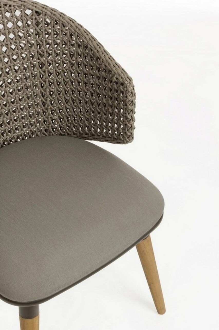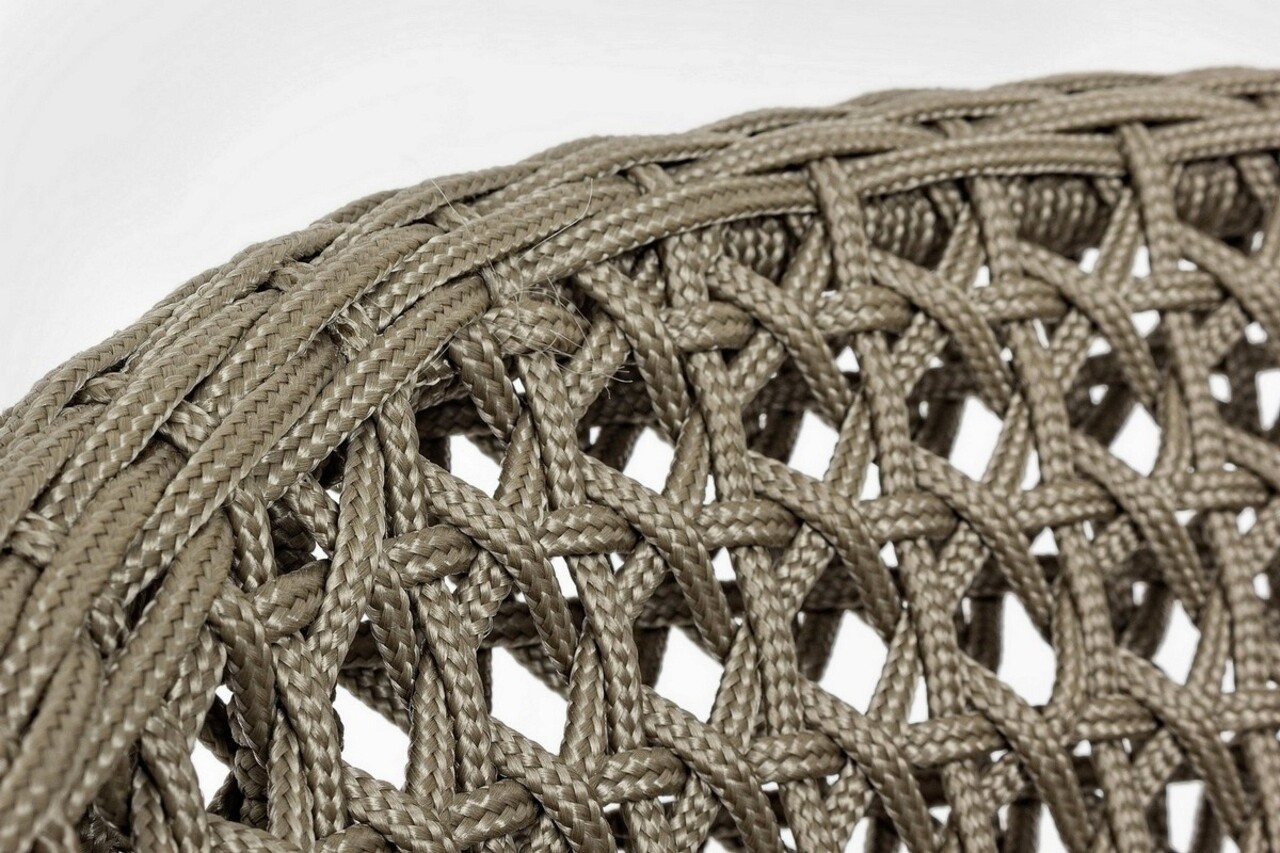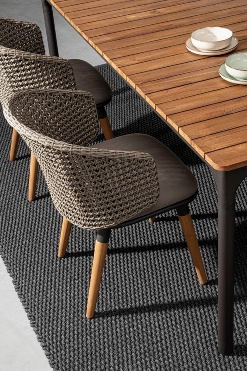 Sezut (nu este detasabil) cu umplutura pentru exterior din spuma cu uscare rapida (impotriva umiditatii). Tesatura pentru exterior Sunbrella (100% acrilic), hidrofuga si rezistenta la razele ultraviolete.