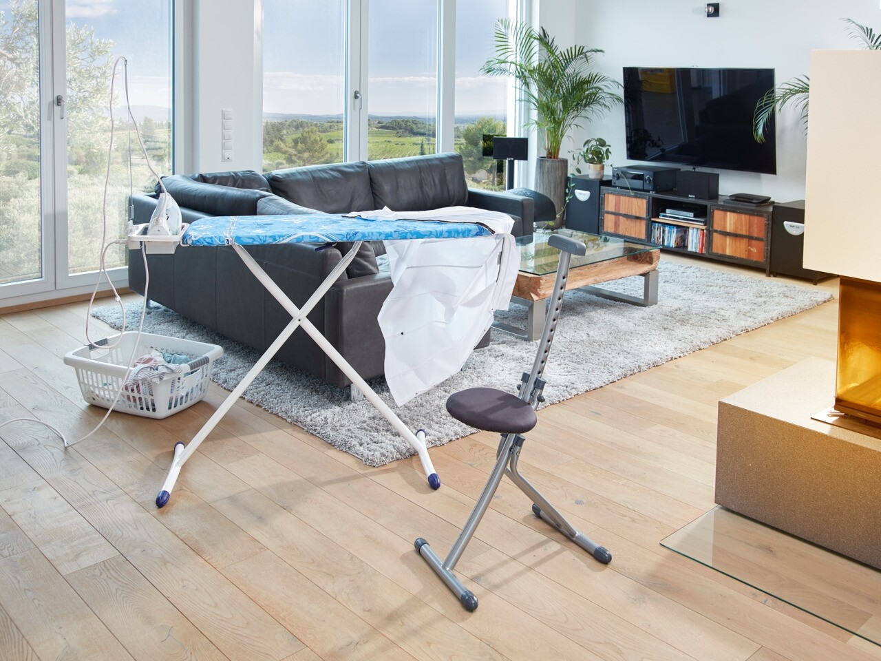Scaunul este foarte practic si ajuta la mentinerea unei posturi bune a corpului in timpul calcatului. Inaltimea este reglabila.