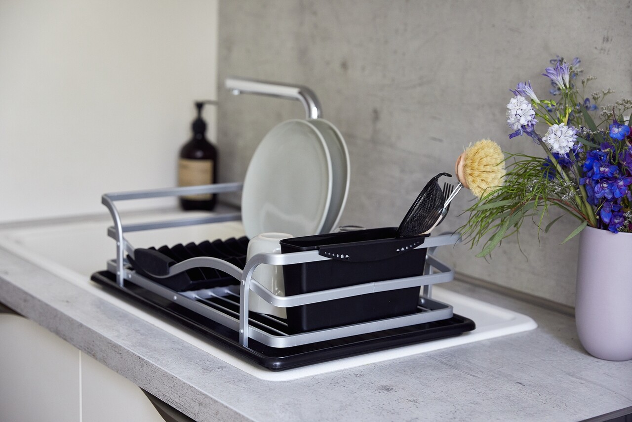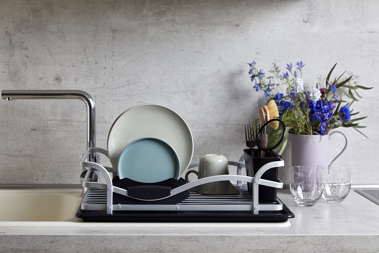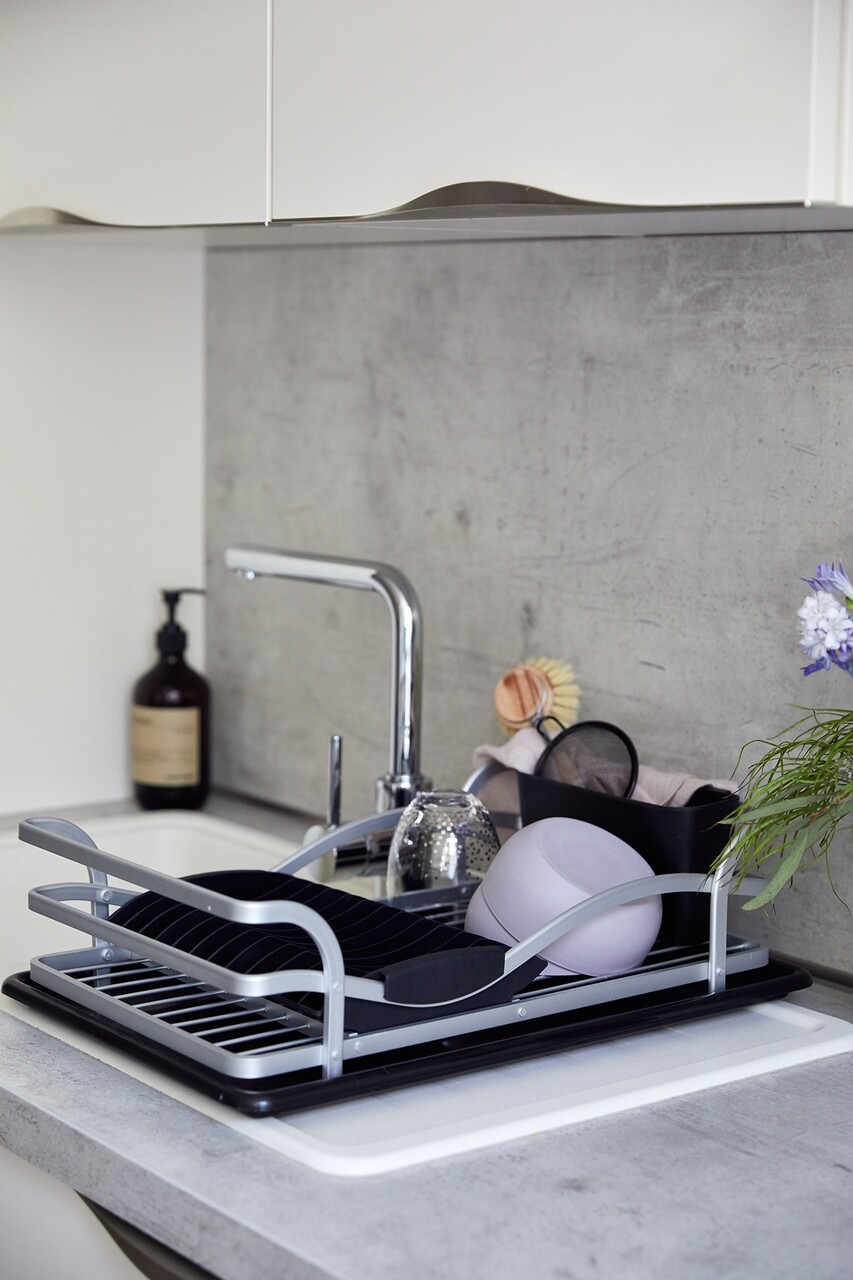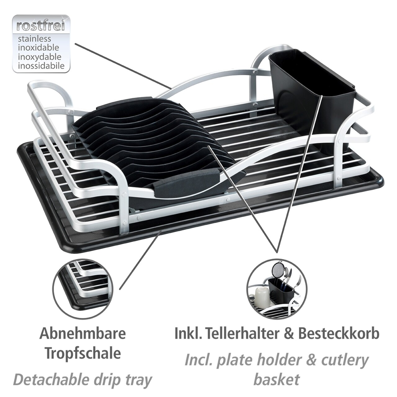 Scurgator de vase cu suport pentru tacamuri Drip, Wenko, 46x31x13 cm, aluminiu/polipropilena, argintiu mat/negru