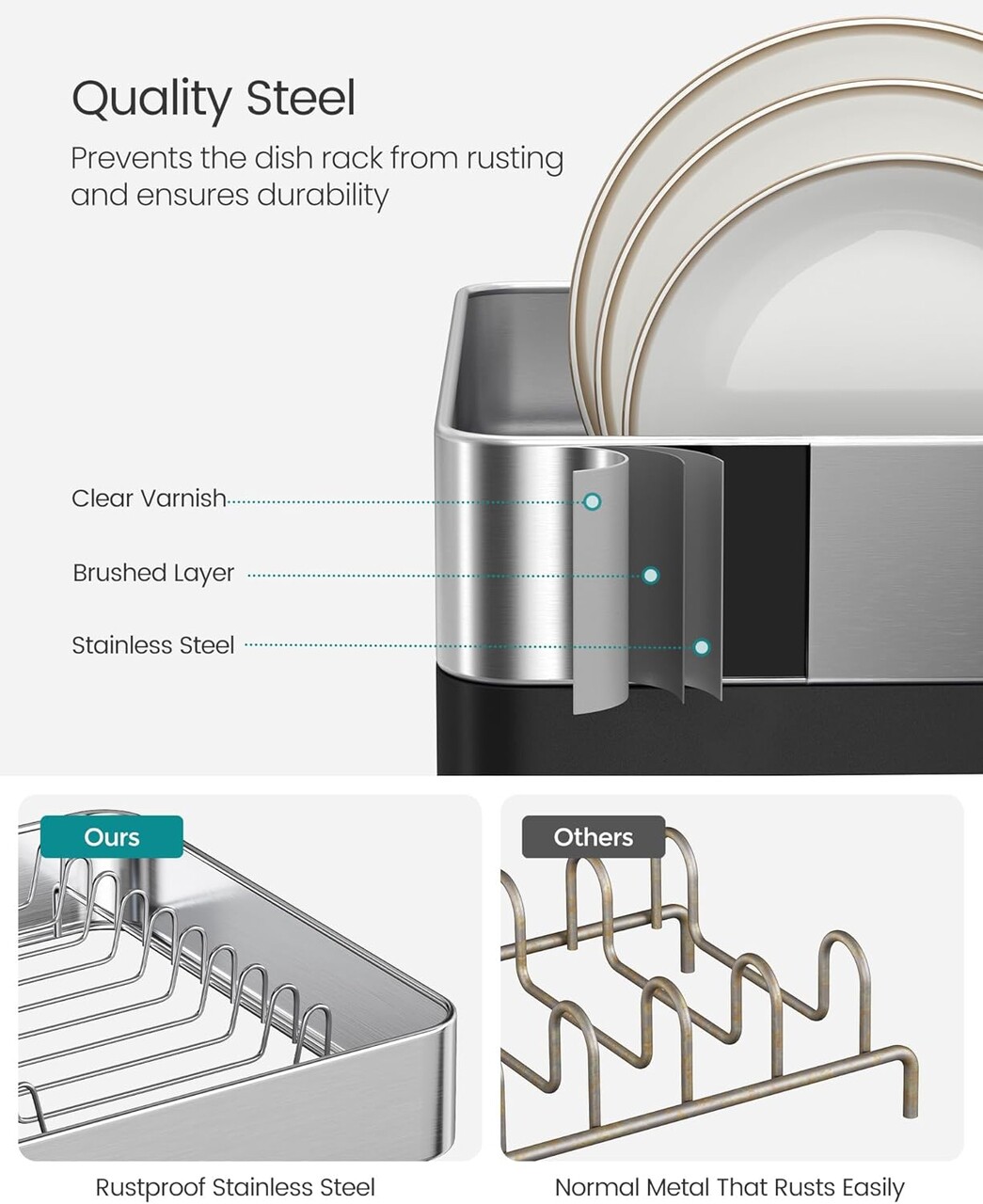 Material premium Fabricat din otel inoxidabil robust, acest suport de uscare pentru vase este rezistent la coroziune si la rugina. Cu constructia sa robusta, acest suport pentru vase poate sustine pana la 22 kg, oferind un suport fiabil pentru vasele dvs.