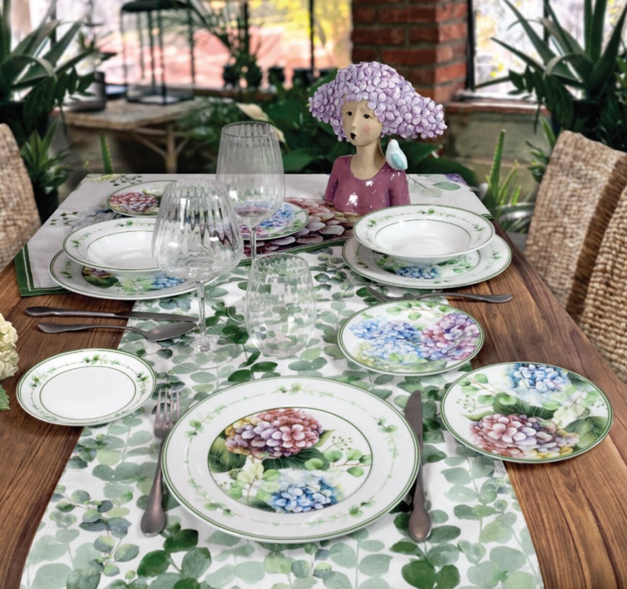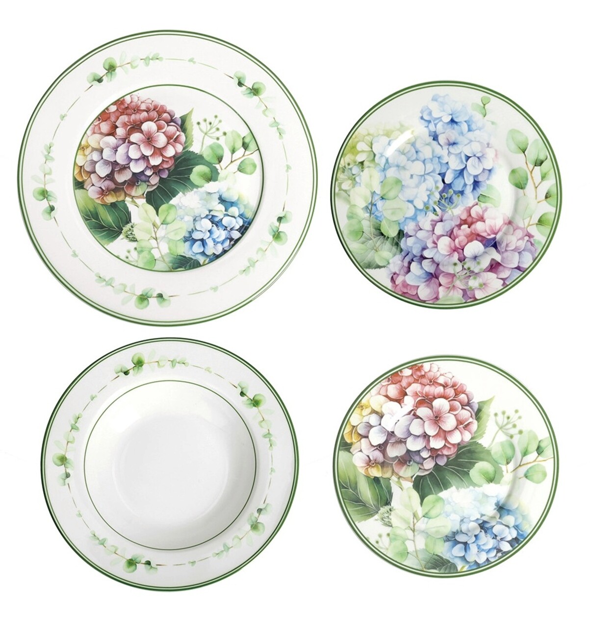 Serviciu de masa Flora - o colectie inspirata de natura luxurianta, care, combinata cu verdele intens tipic gradinilor cele mai infloritoare, ofera spatiilor tale o atmosfera calda si eleganta. Hortensii rafinate si ornamente florale delicate impodobesc portelanul, creand o linie gratioasa perfecta pentru decorarea mesei tale.