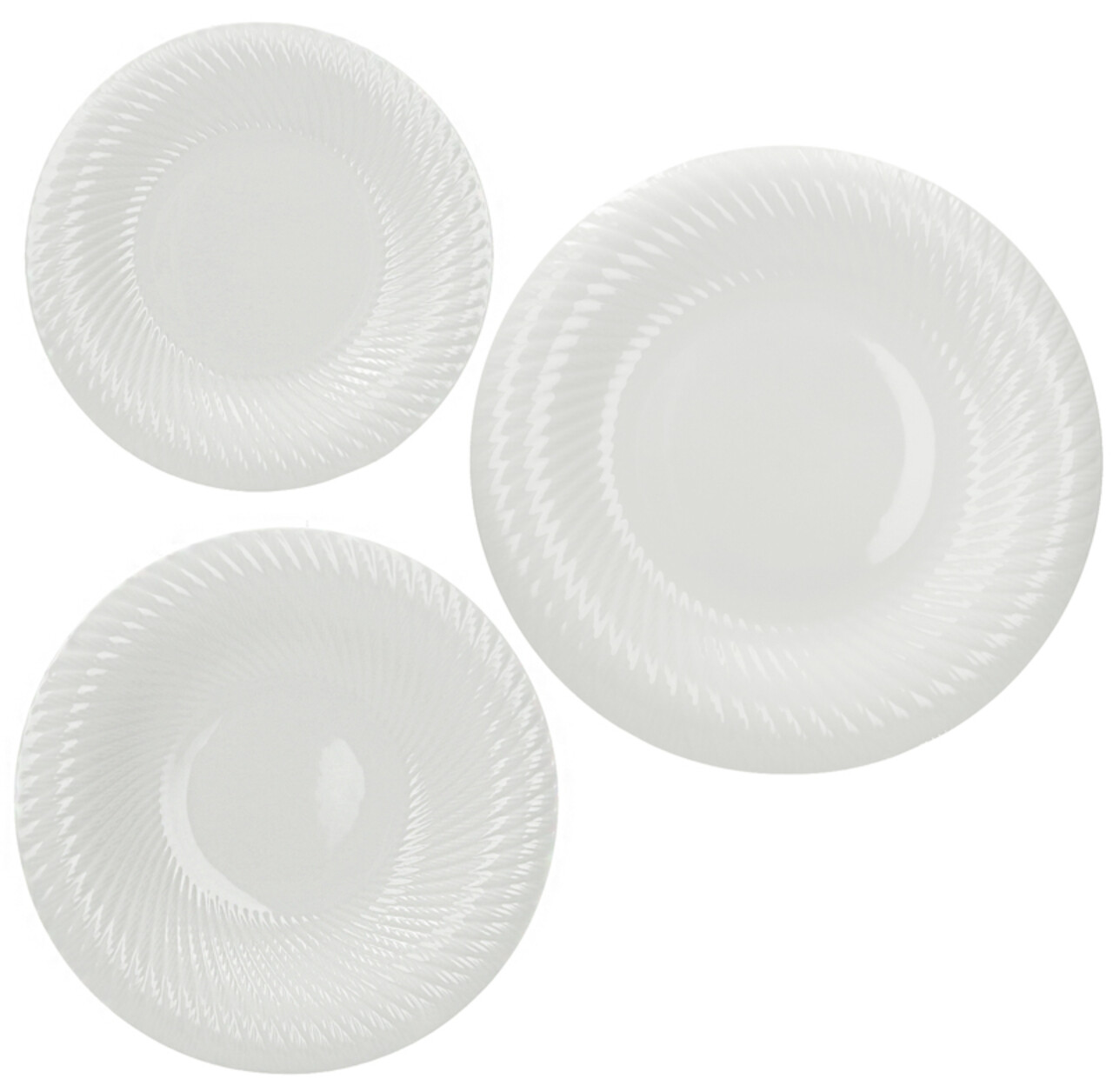 Adu un plus de rafinament mesei tale cu setul de masa Optical, compus din 18 piese (farfurii intinse, adanci si de desert) din portelan alb de calitate superioara. Designul minimalist, pus in valoare de linii optice fine, creeaza un efect vizual subtil, dar de impact.
