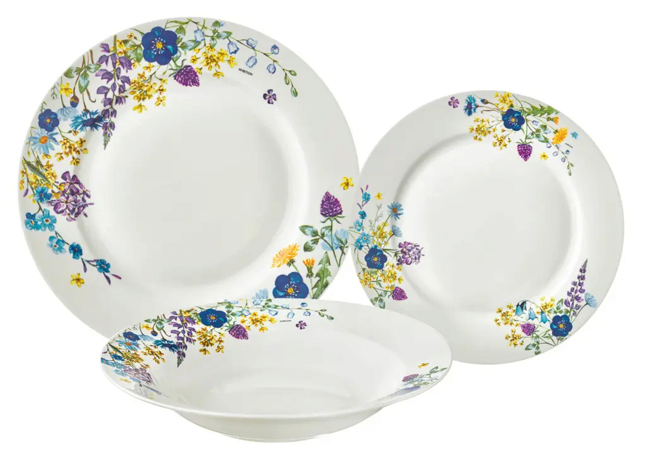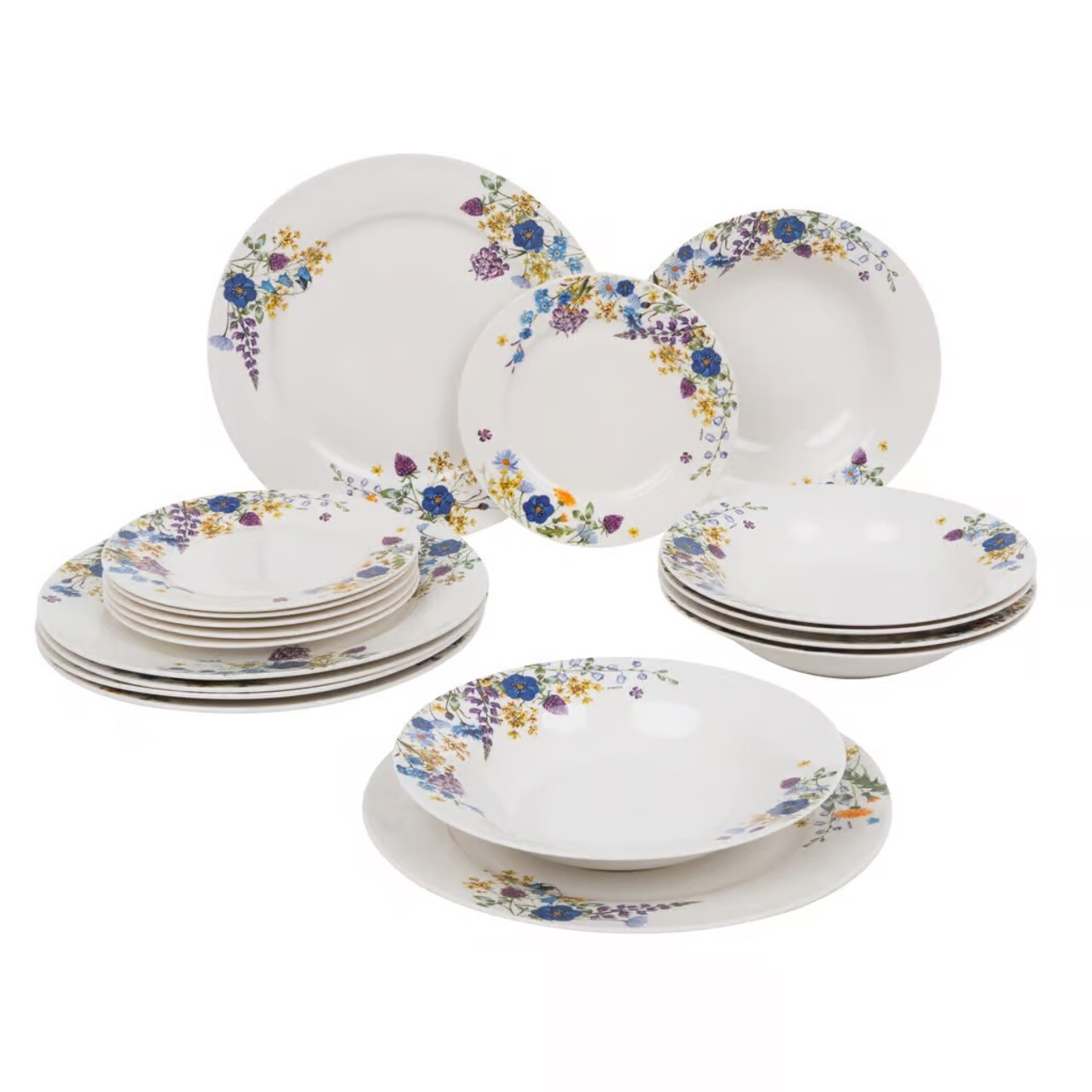 Serviciu de masa din portelan 18 piese Ambition Fiori, model floral, forma rotunda (6 farfurii intinse, 6 farfurii adanci, 6 farfurii desert). Colectia Fiori, Ambition este eleganta si stilata. Florile naturale si salbatice sunt tema principala a colectiei. Florile mici culese de pe camp sunt subtile si delicate si sunt aranjate in smocuri mici, usor imprastiate pe suprafata vaselor, astfel coloritul acestora subliniaza frumos imprimeul portelanului. Decorul este atemporal si potrivit pentru orice sarbatoare.