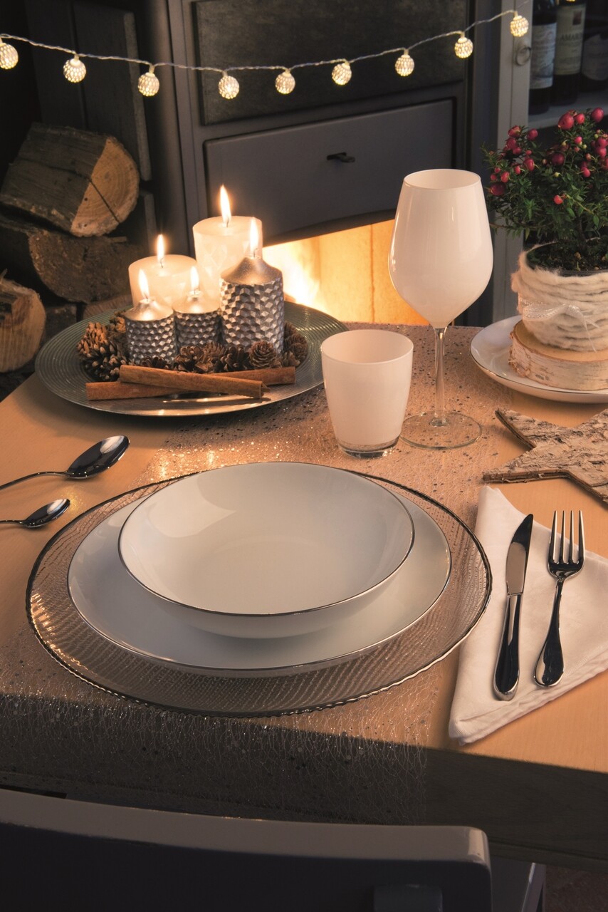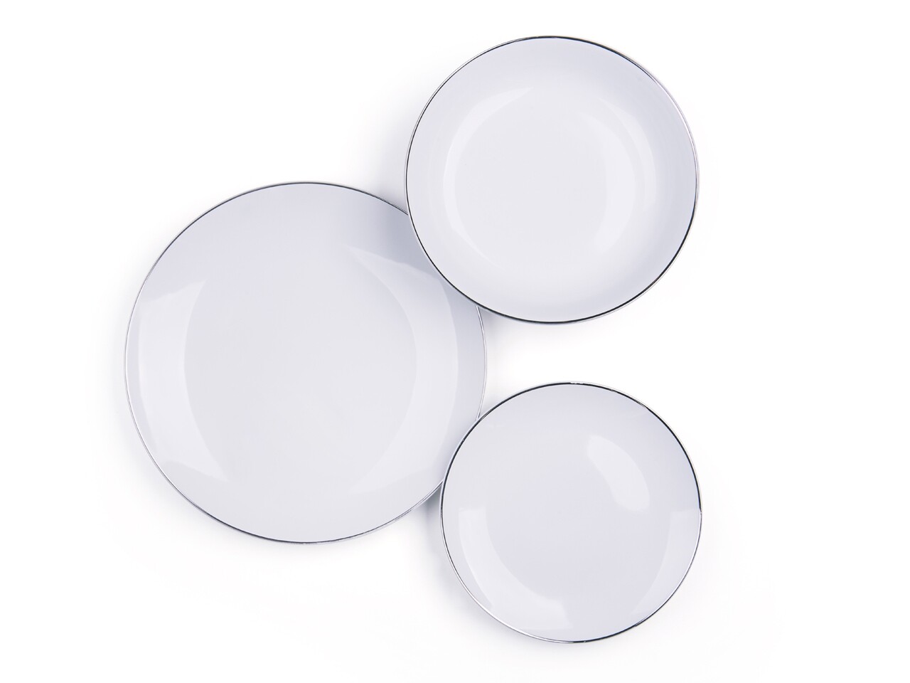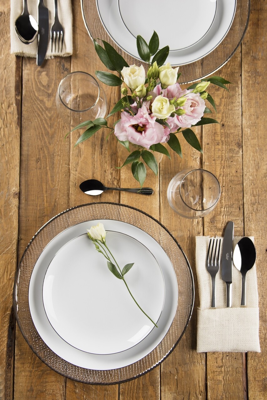 Detaliile sunt cele care fac diferenta. Asa este si in cazul acestui set pentru servit masa. Rafinat, minimalist, acesta este imbogatit cu o linie argintie pe marginea fiecarei piese, conferindu-i o eleganta aparte.